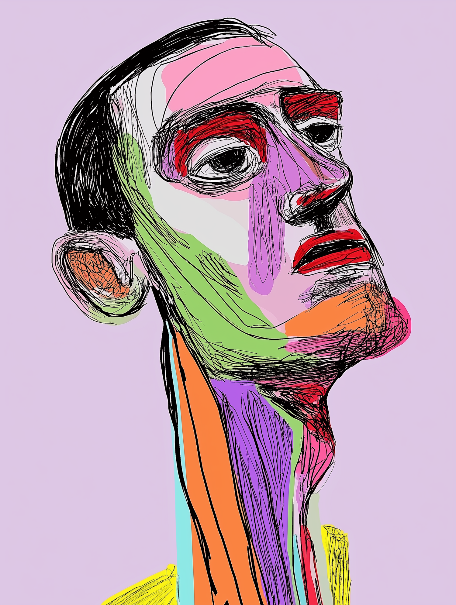 Abstract illustration of a man's face with bold colors and expressive lines on a lavender background.