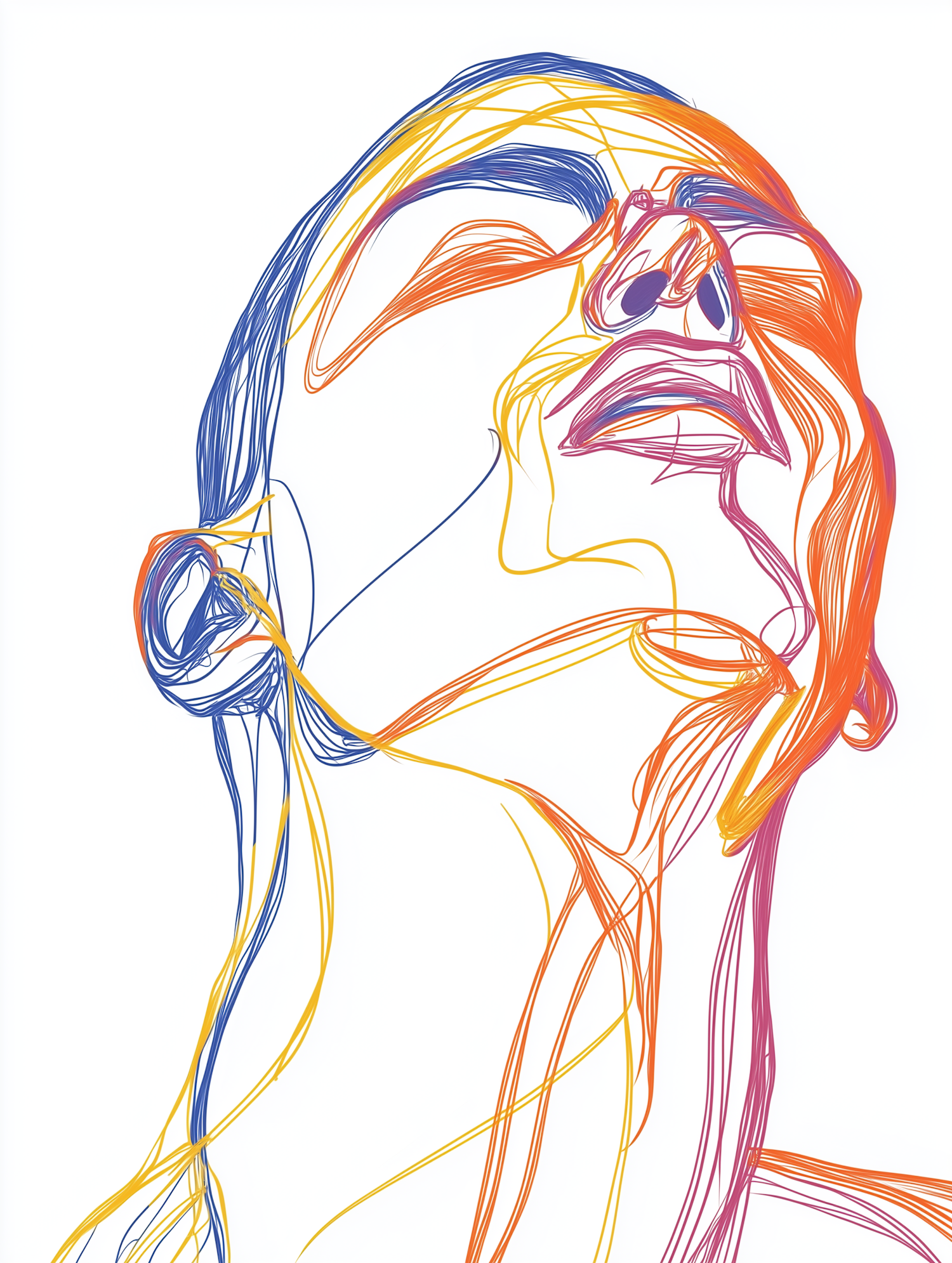 Abstract illustration of a face in vibrant blue, yellow, and orange lines, depicting an upward gaze with a serene expression.