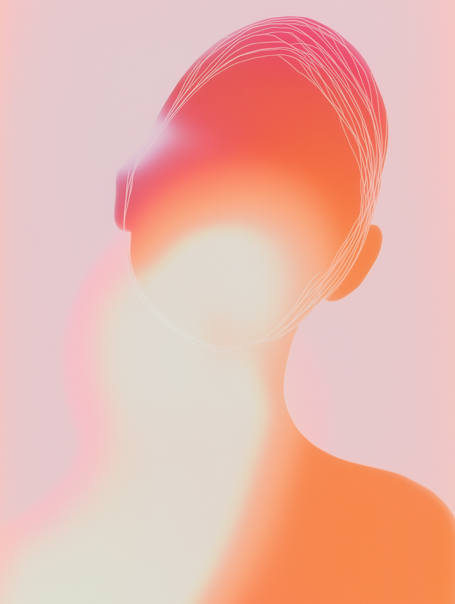 Abstract illustration of a human silhouette with warm gradient colors and delicate white lines on a soft pink background.