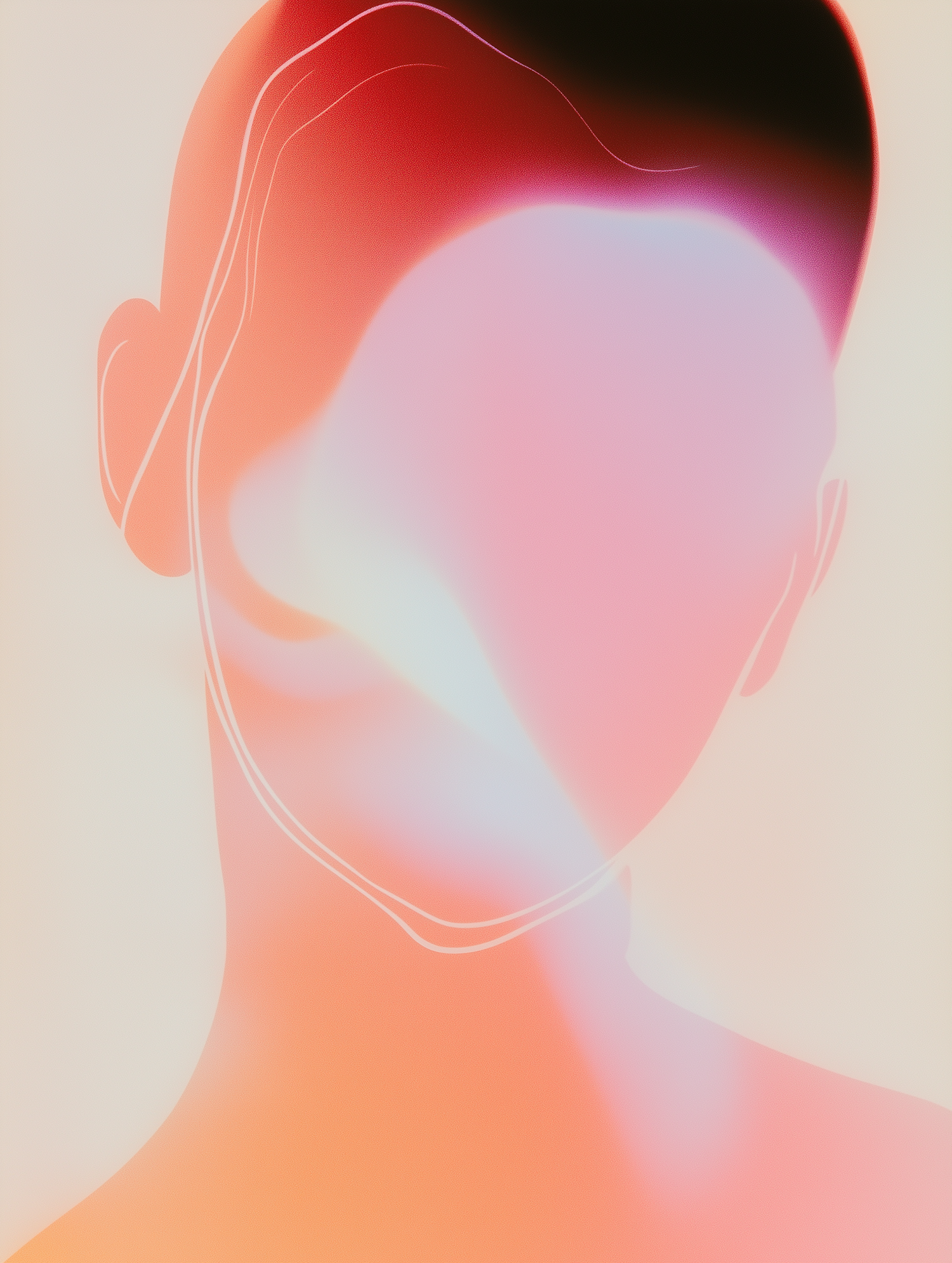 Abstract illustration of a human silhouette with blurred features in warm red, orange, and pink hues, creating a mysterious and ethereal effect.