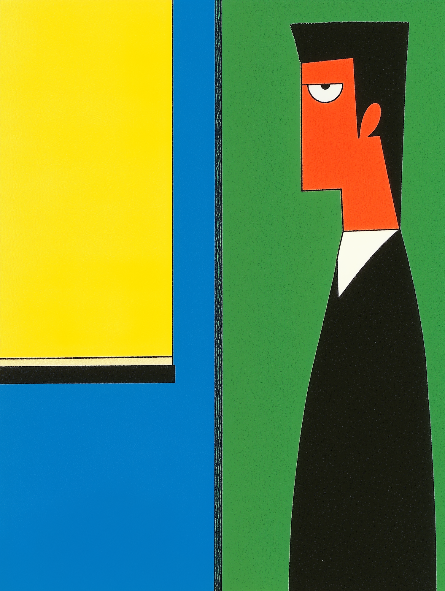 Stylized illustration of a geometric character with bold colors and clean lines, featuring a green, blue, and yellow background.