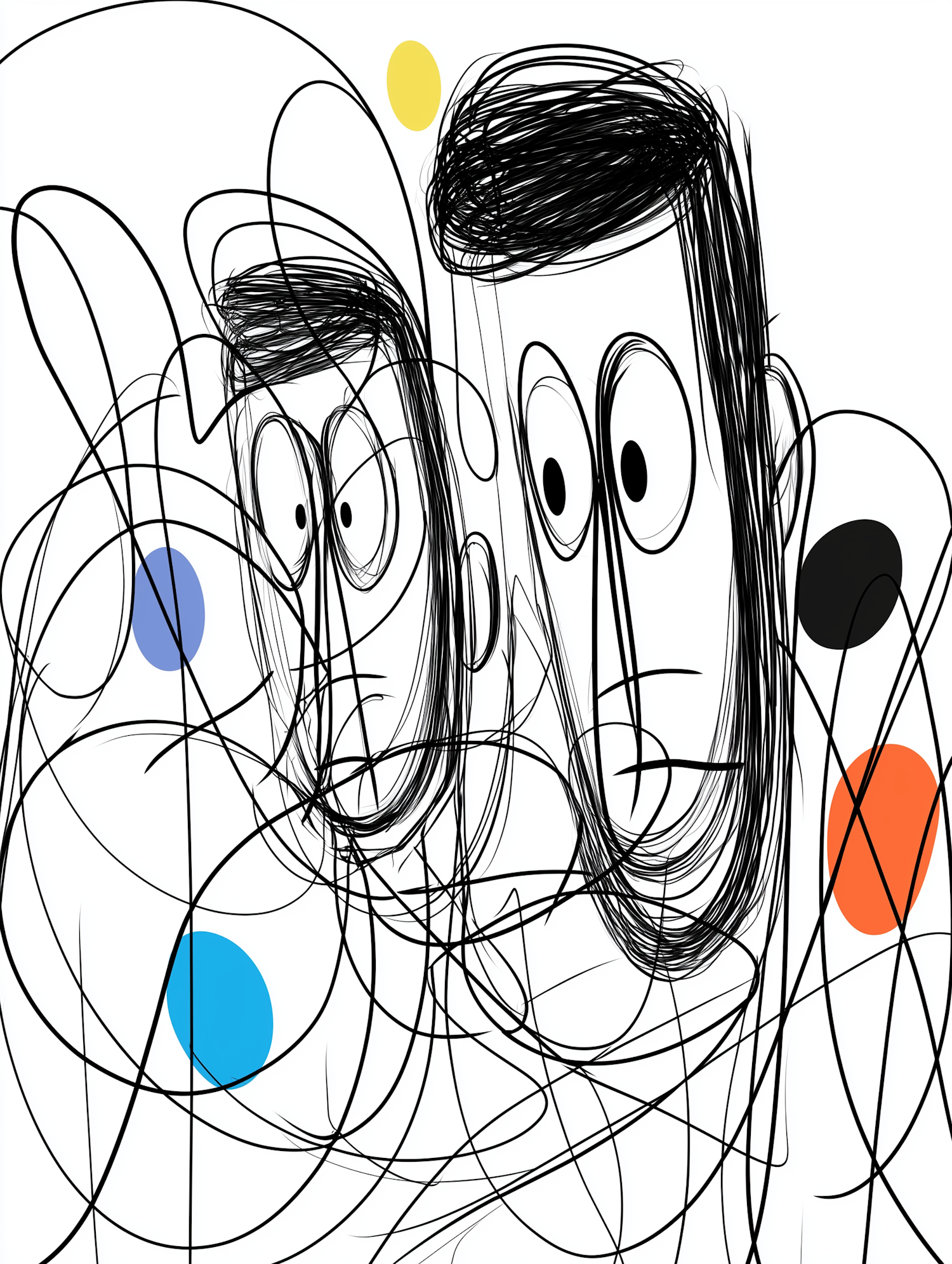 Whimsical illustration of two cartoon faces with exaggerated features and colorful dots, creating a playful and dynamic scene.