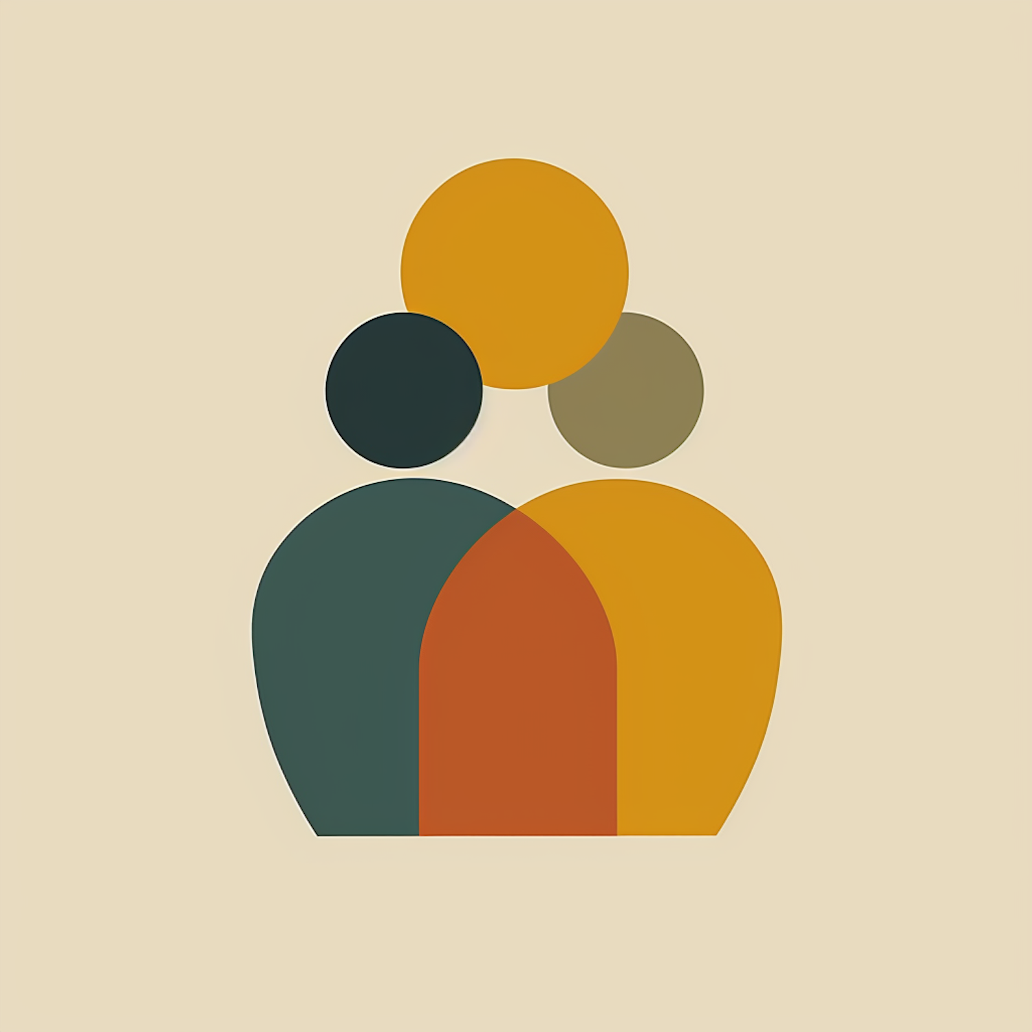 Minimalist abstract art with overlapping shapes in earthy tones, symbolizing unity and connection on a soft beige background.
