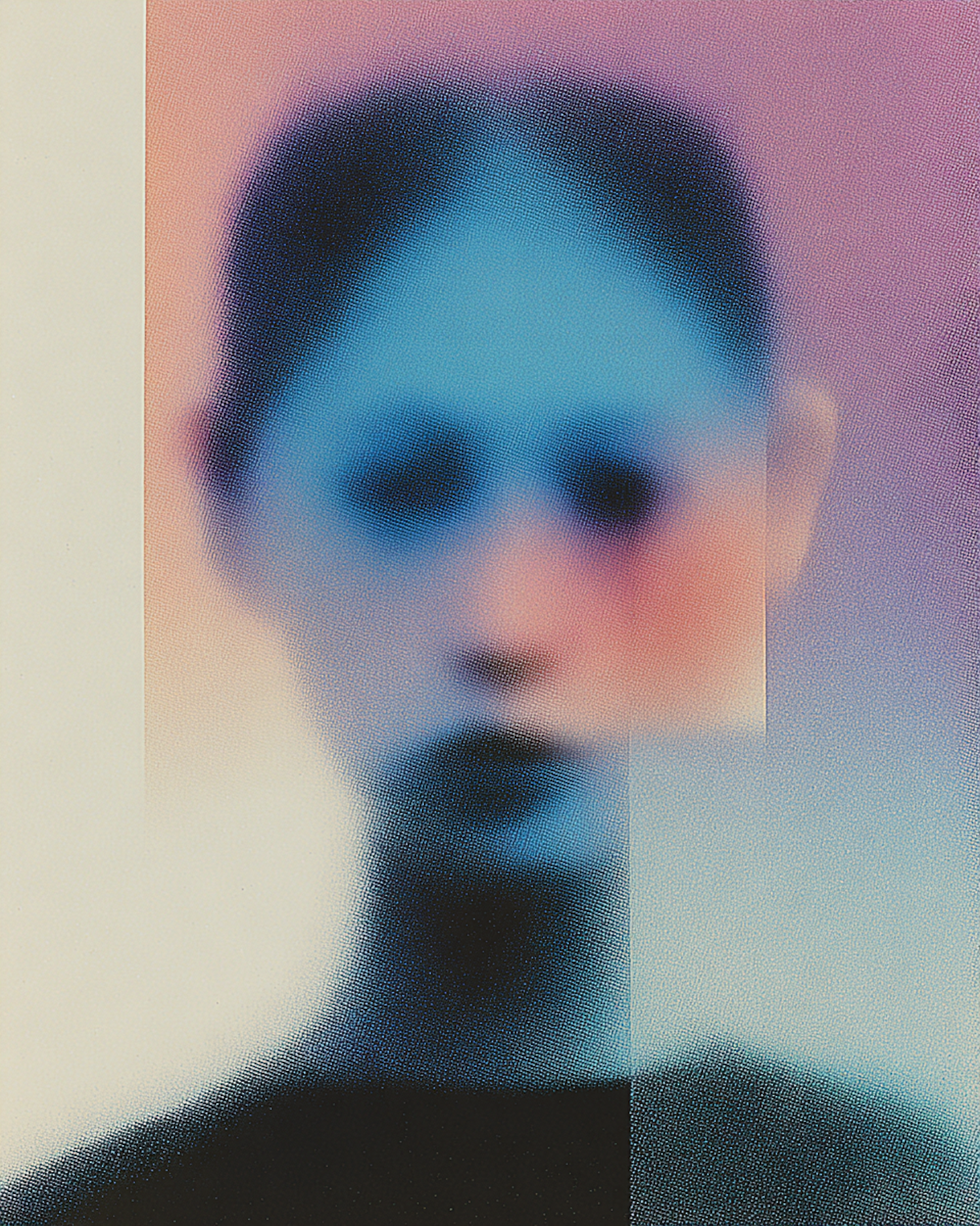Abstract artwork of a blurred human figure with vibrant gradients of blue, pink, and purple, creating a surreal and dreamlike effect.