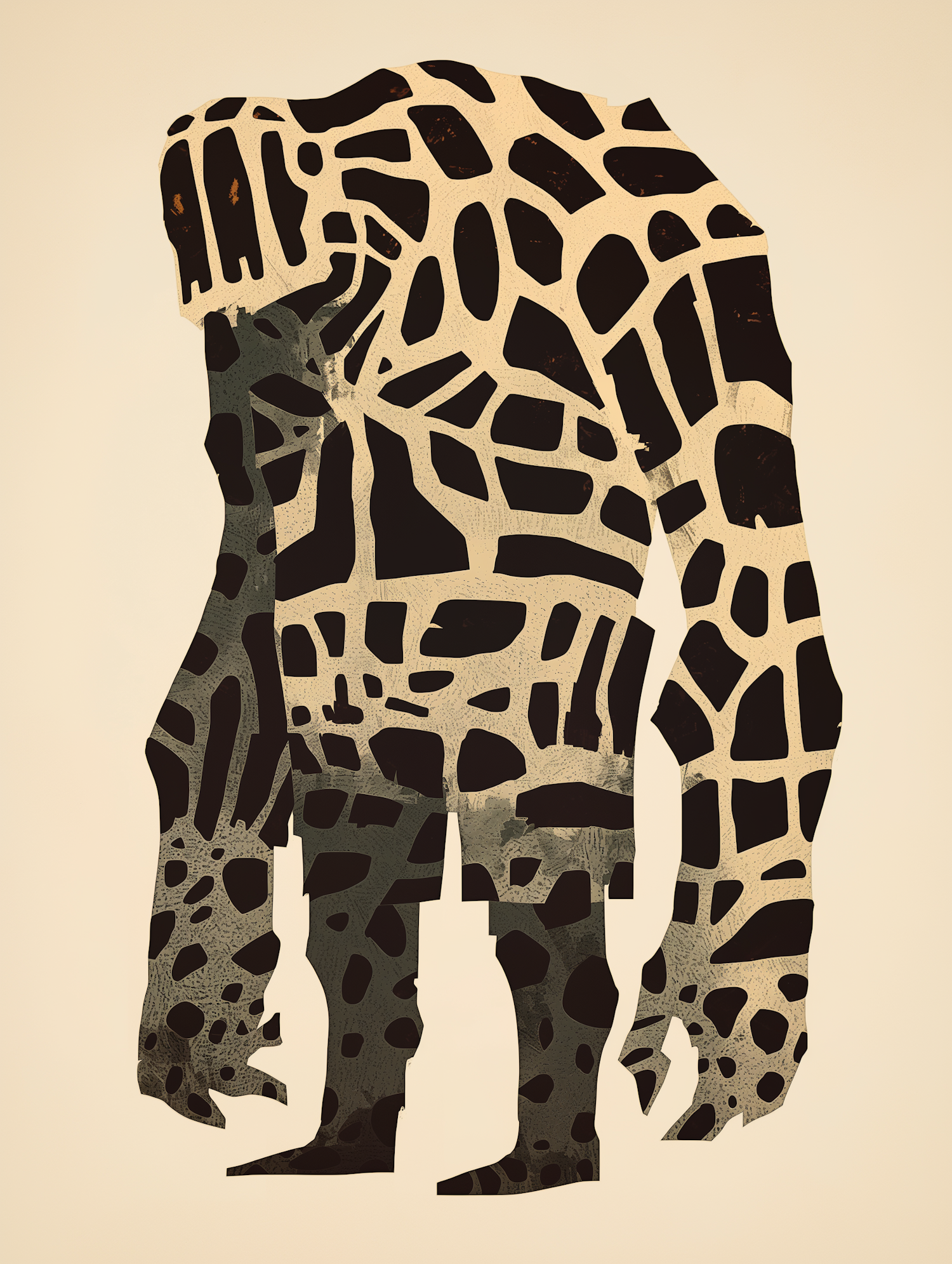 Abstract humanoid figure with a patterned body resembling animal spots, set against a plain beige background.