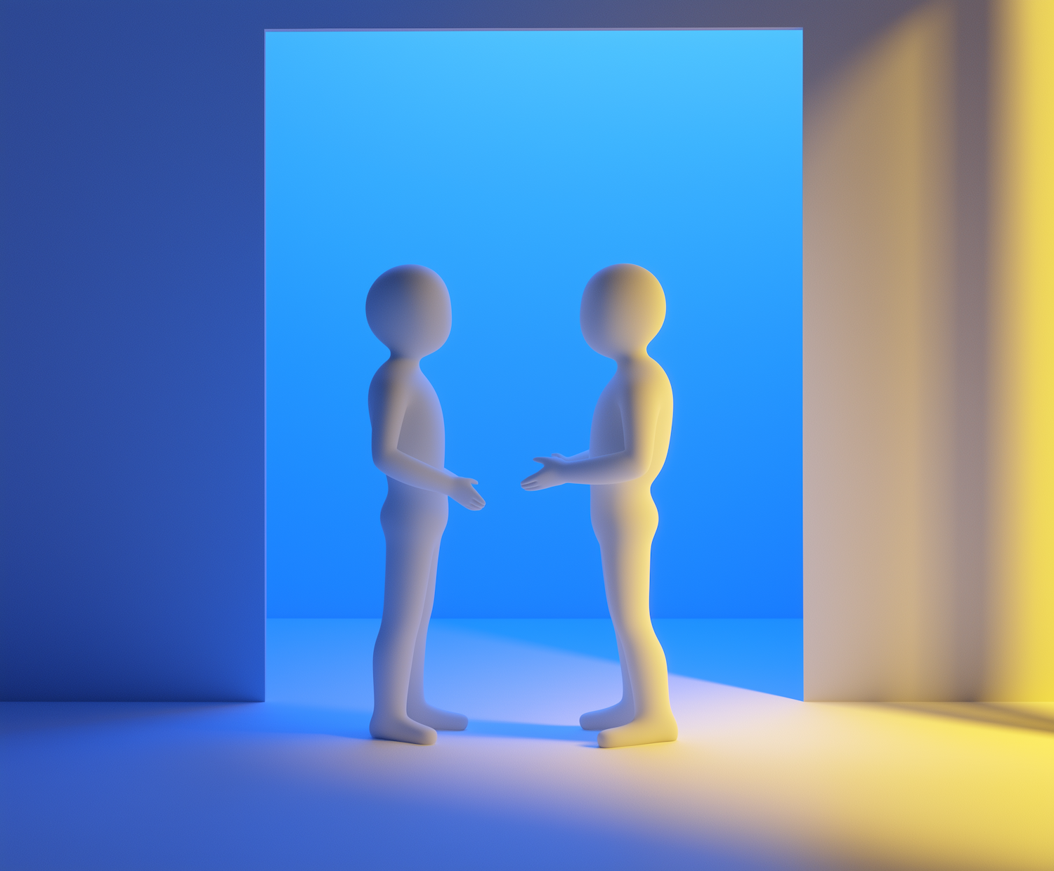 Two abstract humanoid figures in a blue and yellow lit room, engaged in conversation. Minimalist and modern design.