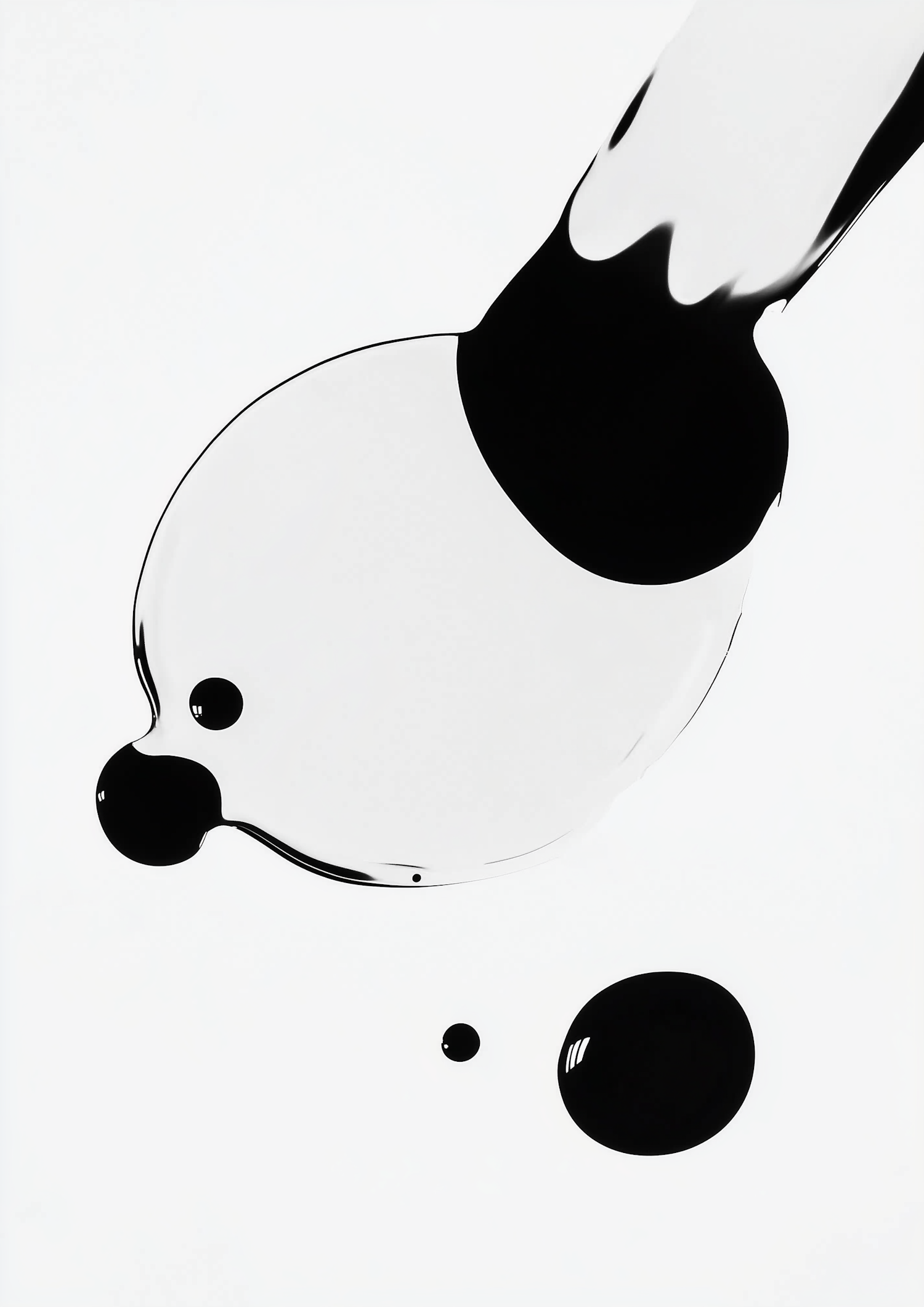 Minimalist abstract art with black ink droplets on white, showcasing fluid shapes and glossy reflections for a striking visual contrast.