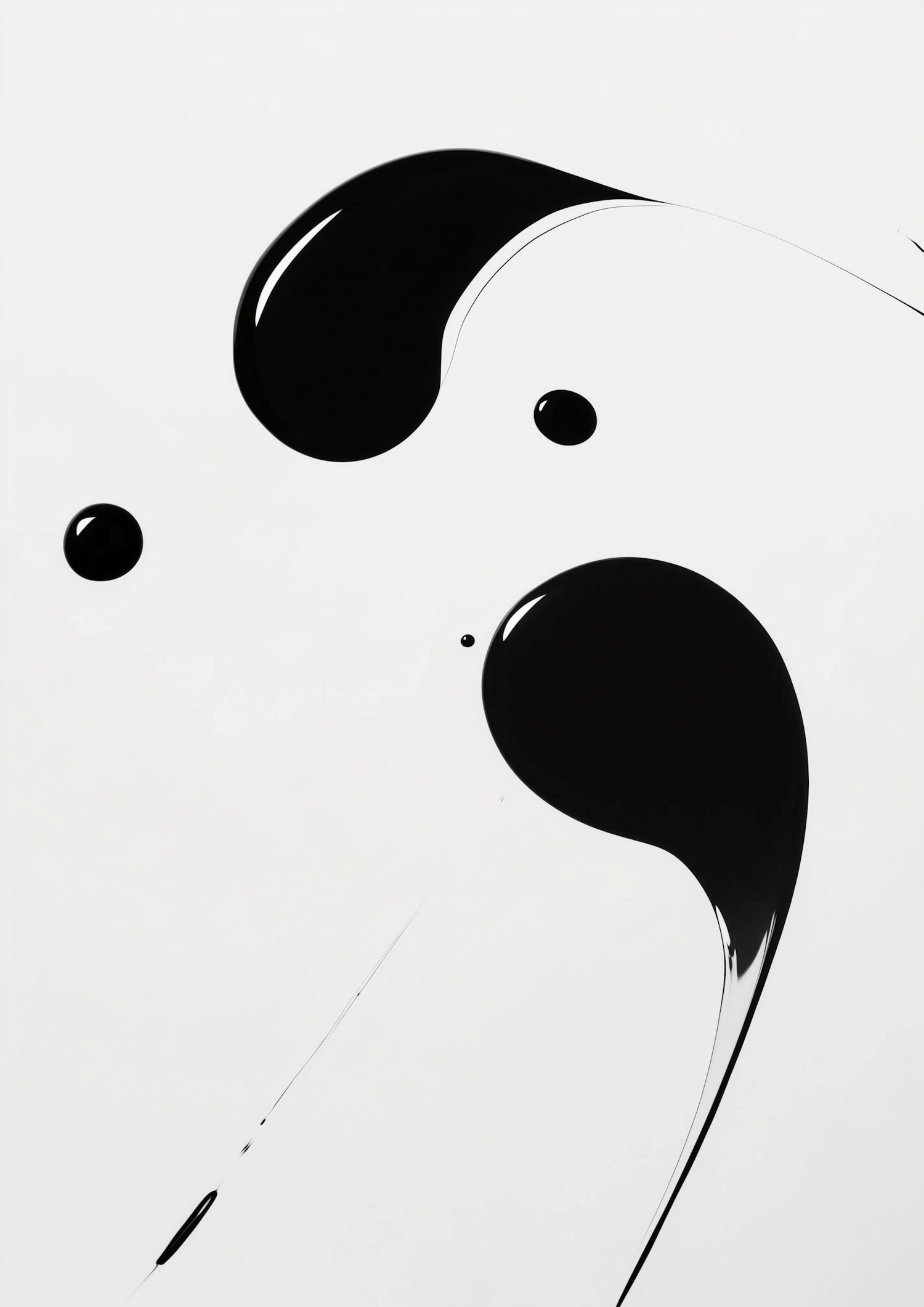 Minimalist black ink droplets on a white background, creating a striking abstract composition with smooth curves and glossy highlights.