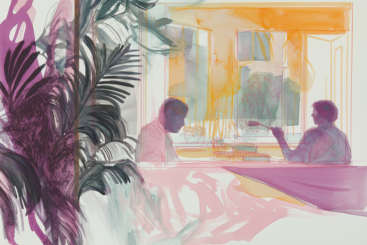 Abstract illustration of two figures dining, surrounded by vibrant colors and foliage, creating a dreamy, artistic atmosphere.