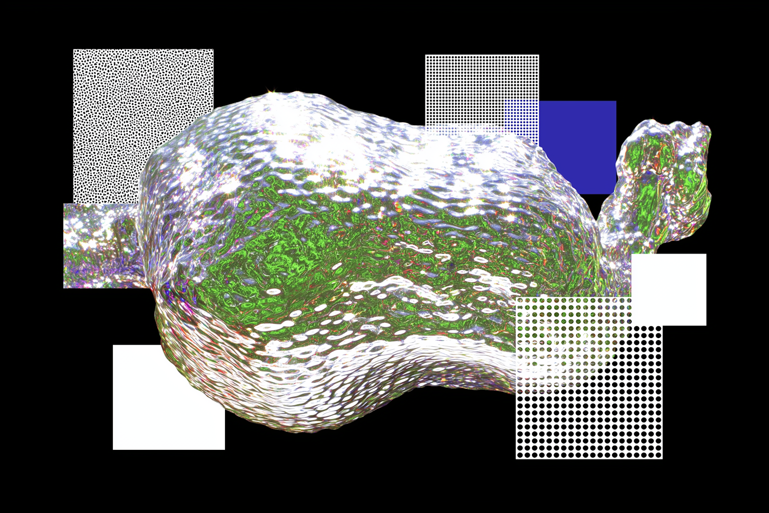 Abstract digital artwork with a reflective, fluid-like form surrounded by geometric patterns on a black background.
