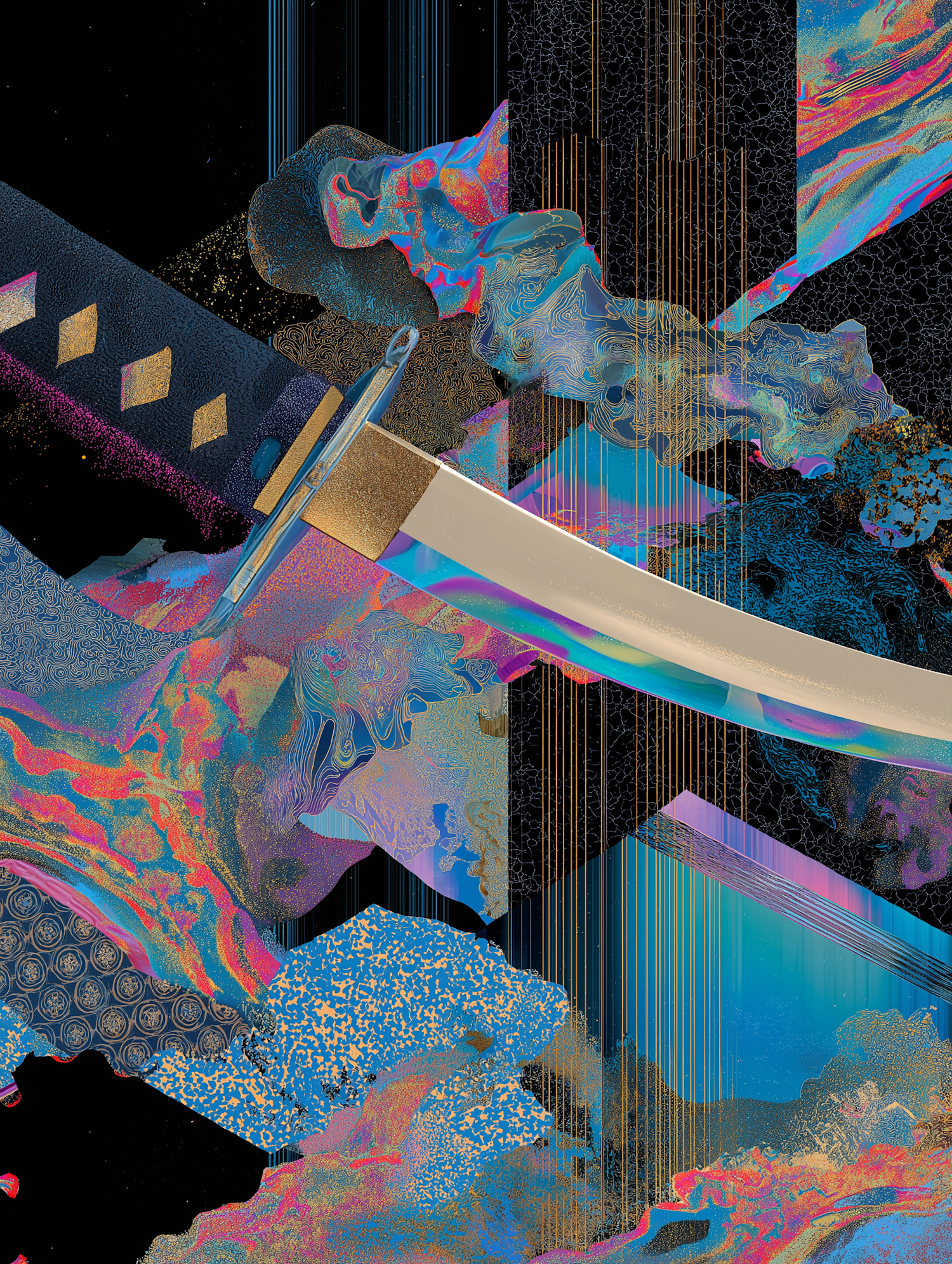 Abstract digital art featuring a katana sword amidst swirling, colorful patterns in blue, pink, and gold, creating a dynamic and vibrant scene.