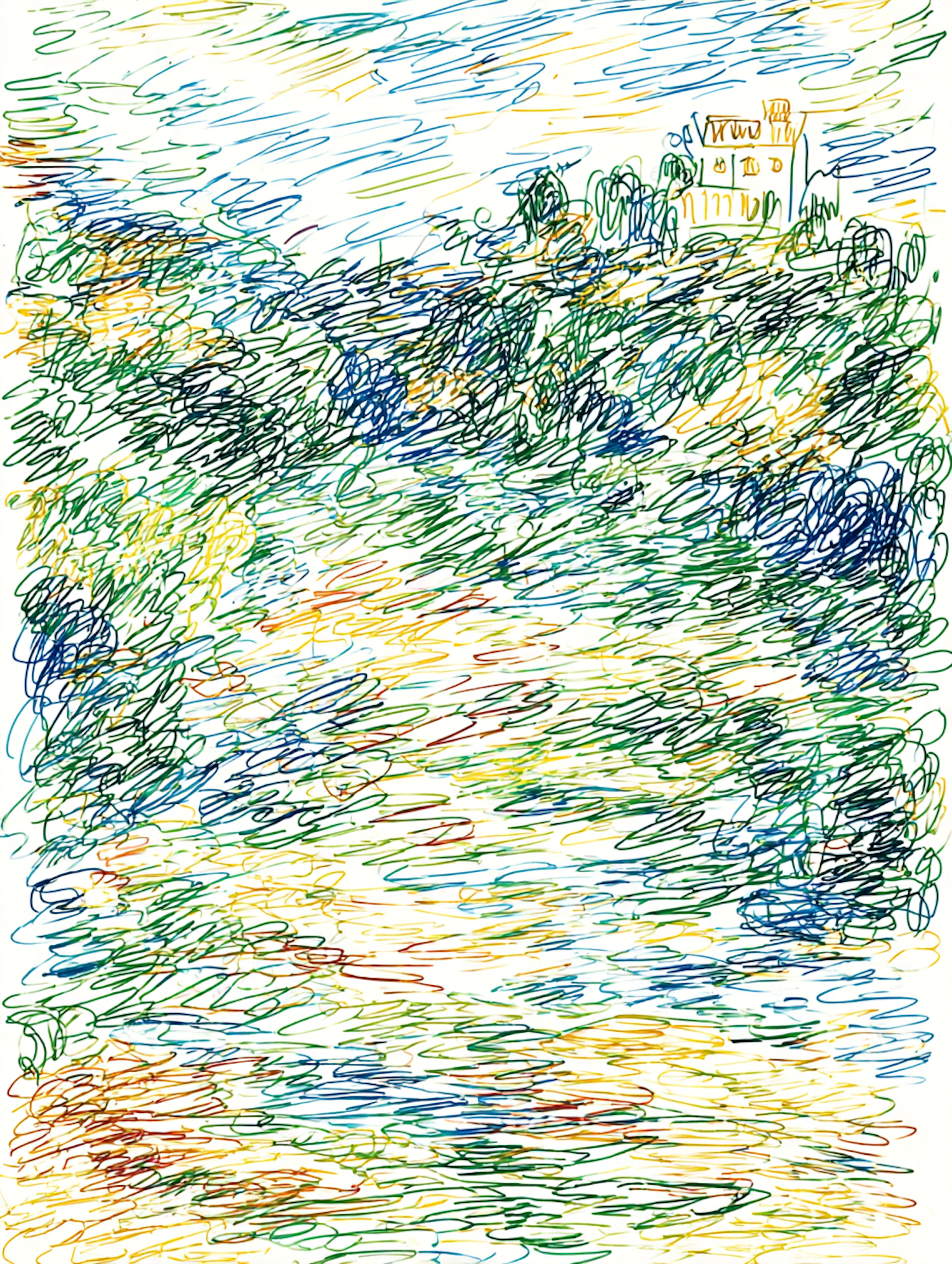 Abstract landscape illustration with vibrant strokes of green, blue, and yellow, featuring a distant building in an impressionistic style.