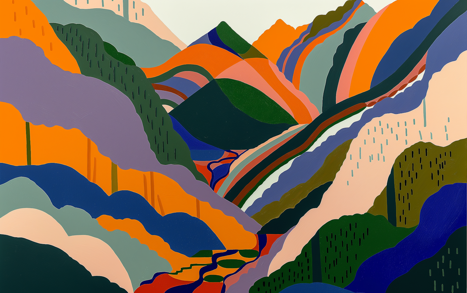 Colorful abstract landscape with vibrant mountains and valleys, featuring bold shades of orange, green, blue, and purple.