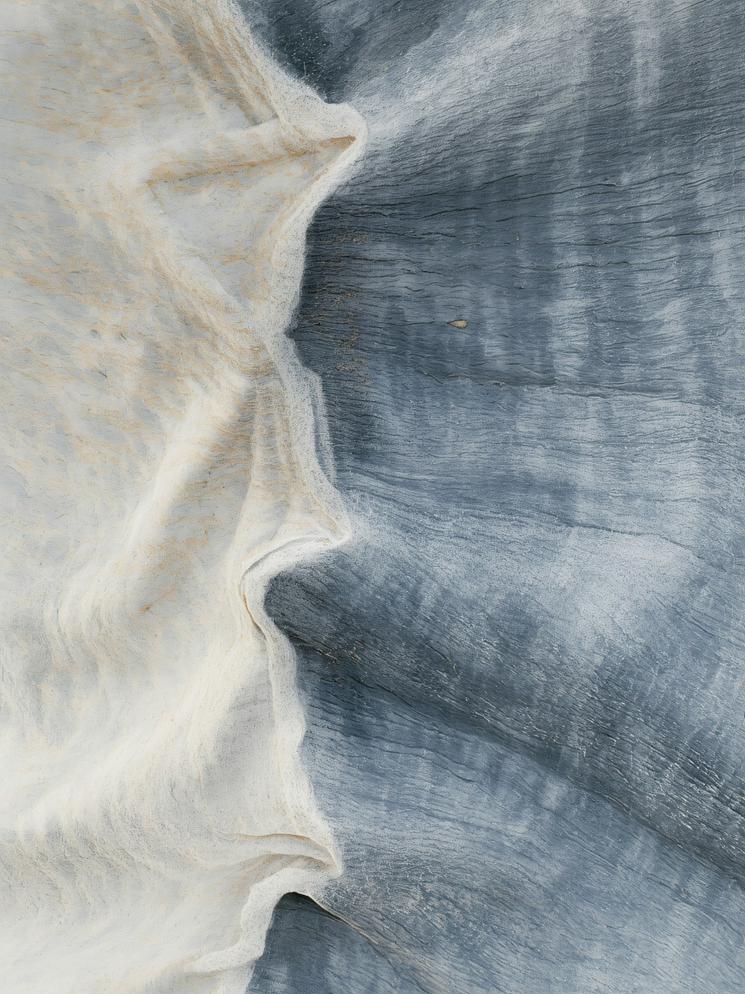 Abstract texture with flowing white and blue-gray tones, resembling natural formations or aerial landscapes.