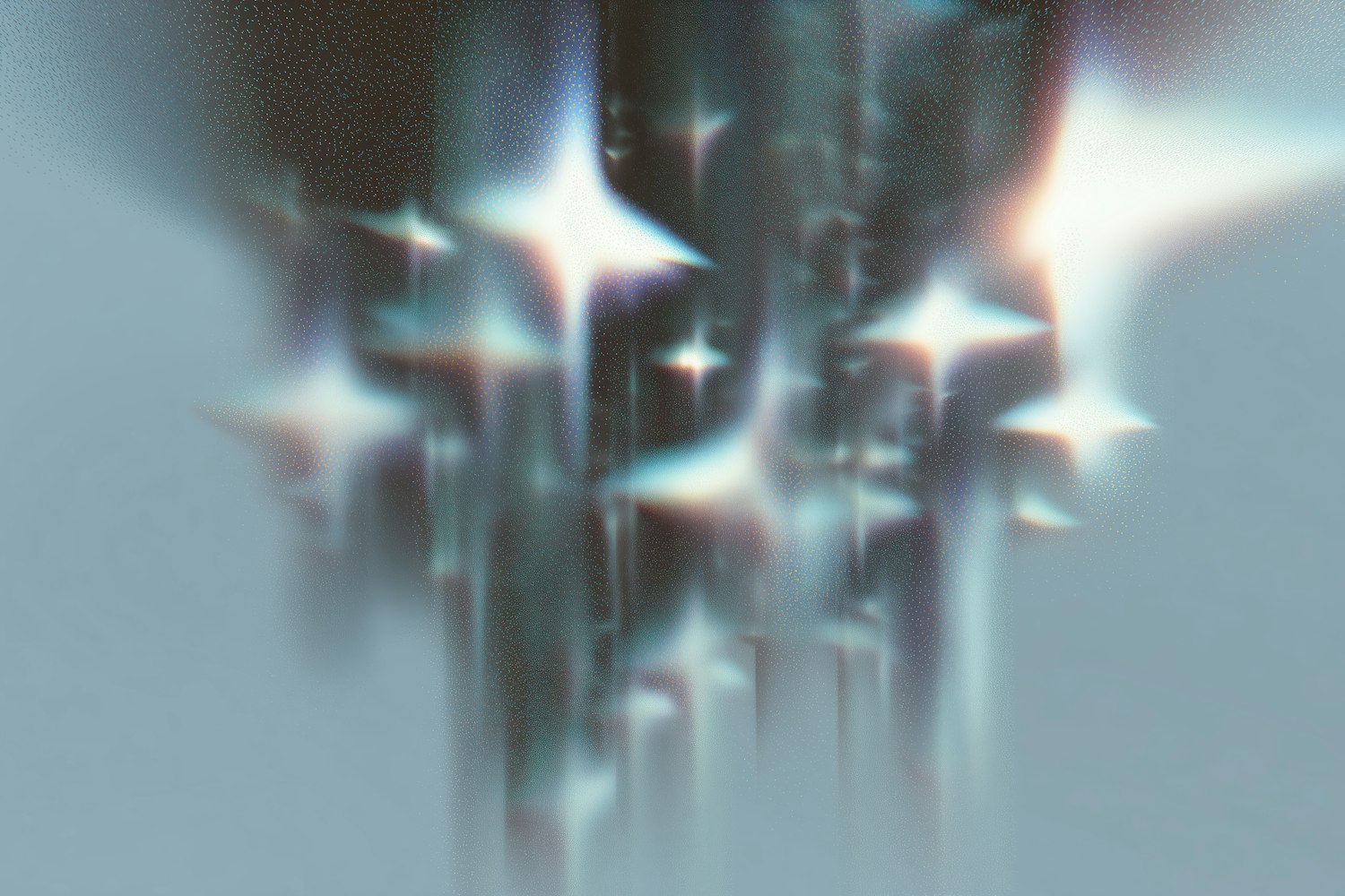 Abstract glowing star-like shapes cascade in soft blues and whites, creating a dreamy, ethereal visual effect.
