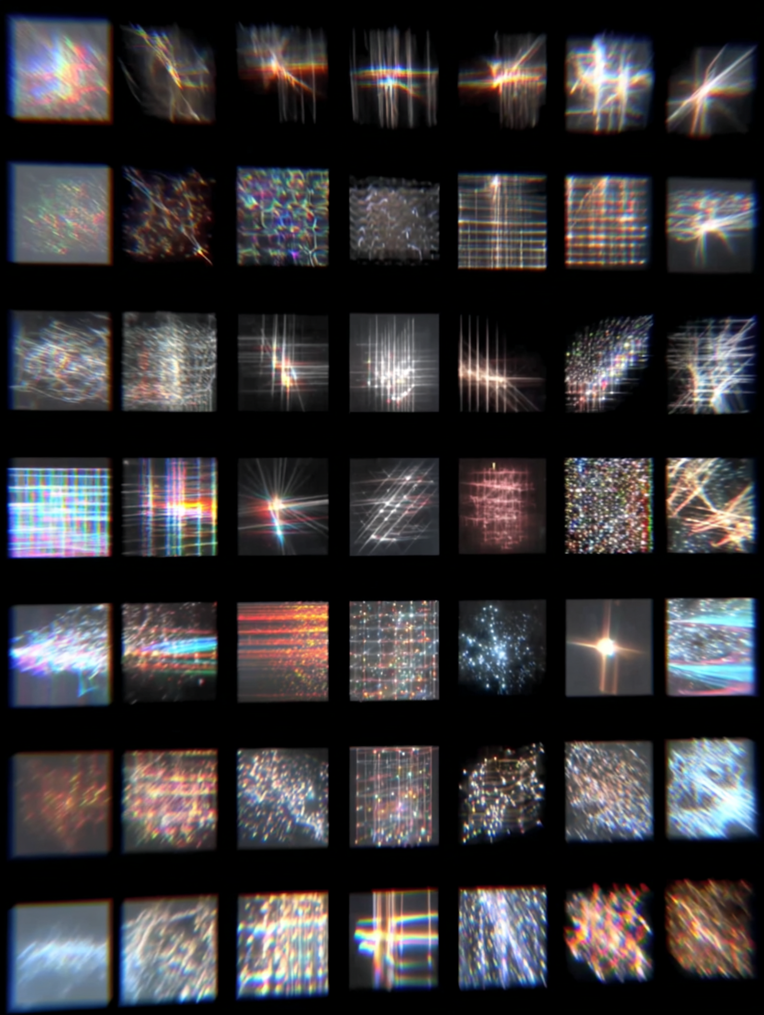 A grid of colorful abstract light patterns on a black background, showcasing diverse designs and vibrant hues.