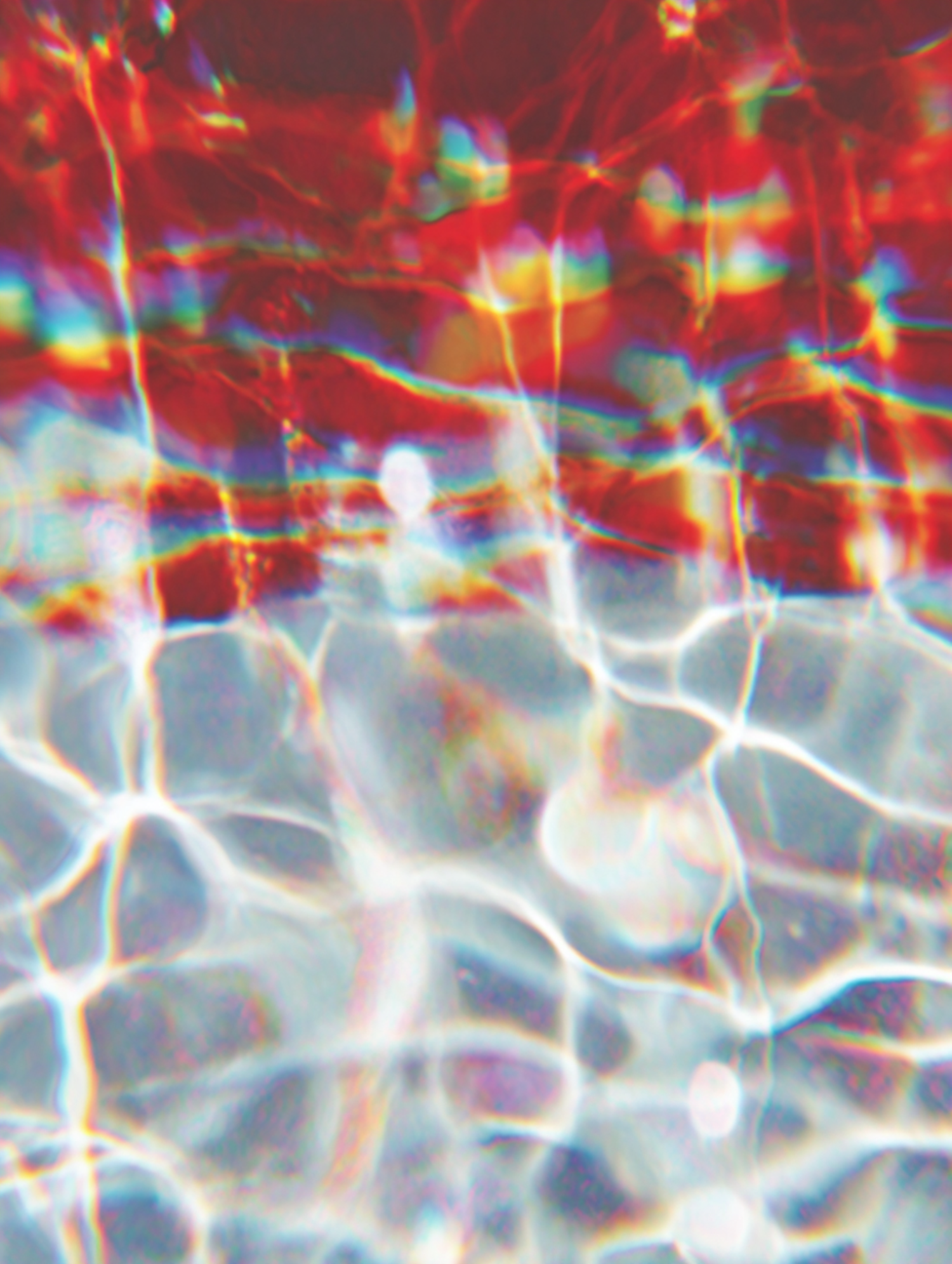 Abstract light patterns with vibrant red, orange, and blue hues, resembling refracted light through water or glass.