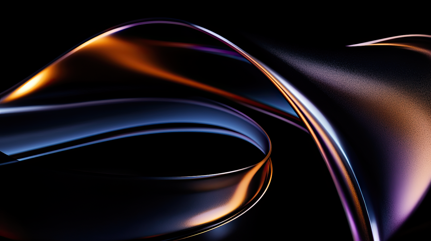 Abstract ribbons of light in orange, blue, and purple hues flow gracefully against a dark background, creating a sleek and futuristic vibe.
