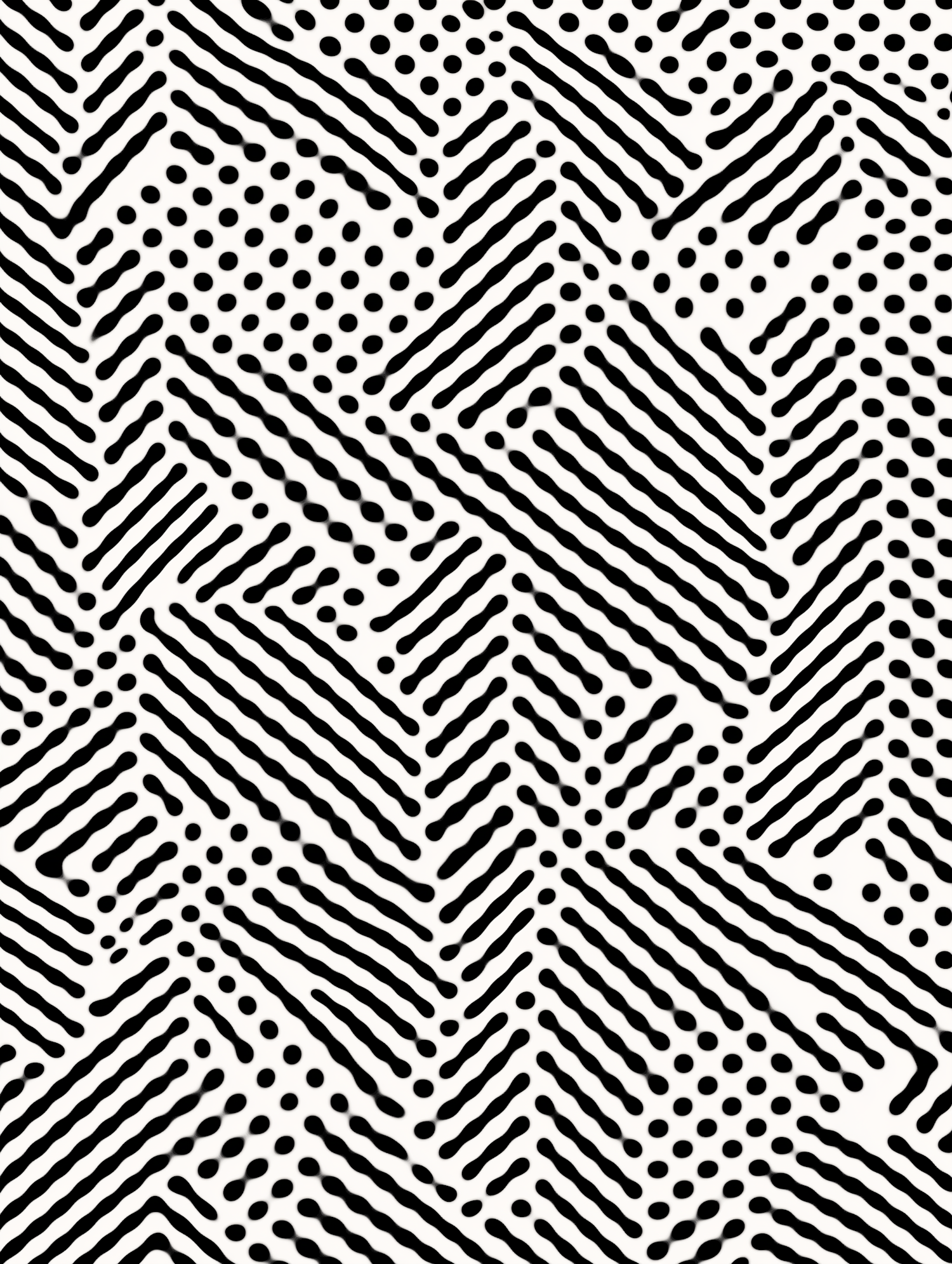 Black and white abstract pattern with wavy diagonal lines and dots, creating a dynamic and textured geometric design.