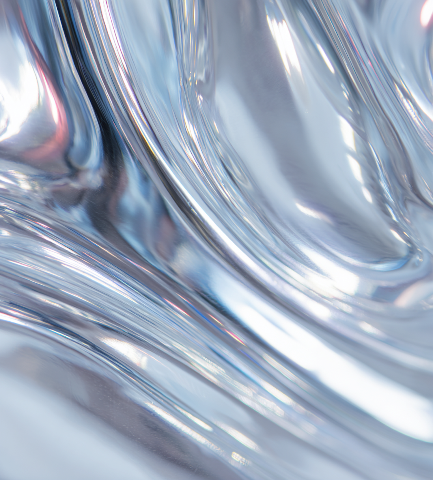Abstract close-up of smooth, flowing shapes in silver and blue, dynamically reflecting light to create mesmerizing highlights.