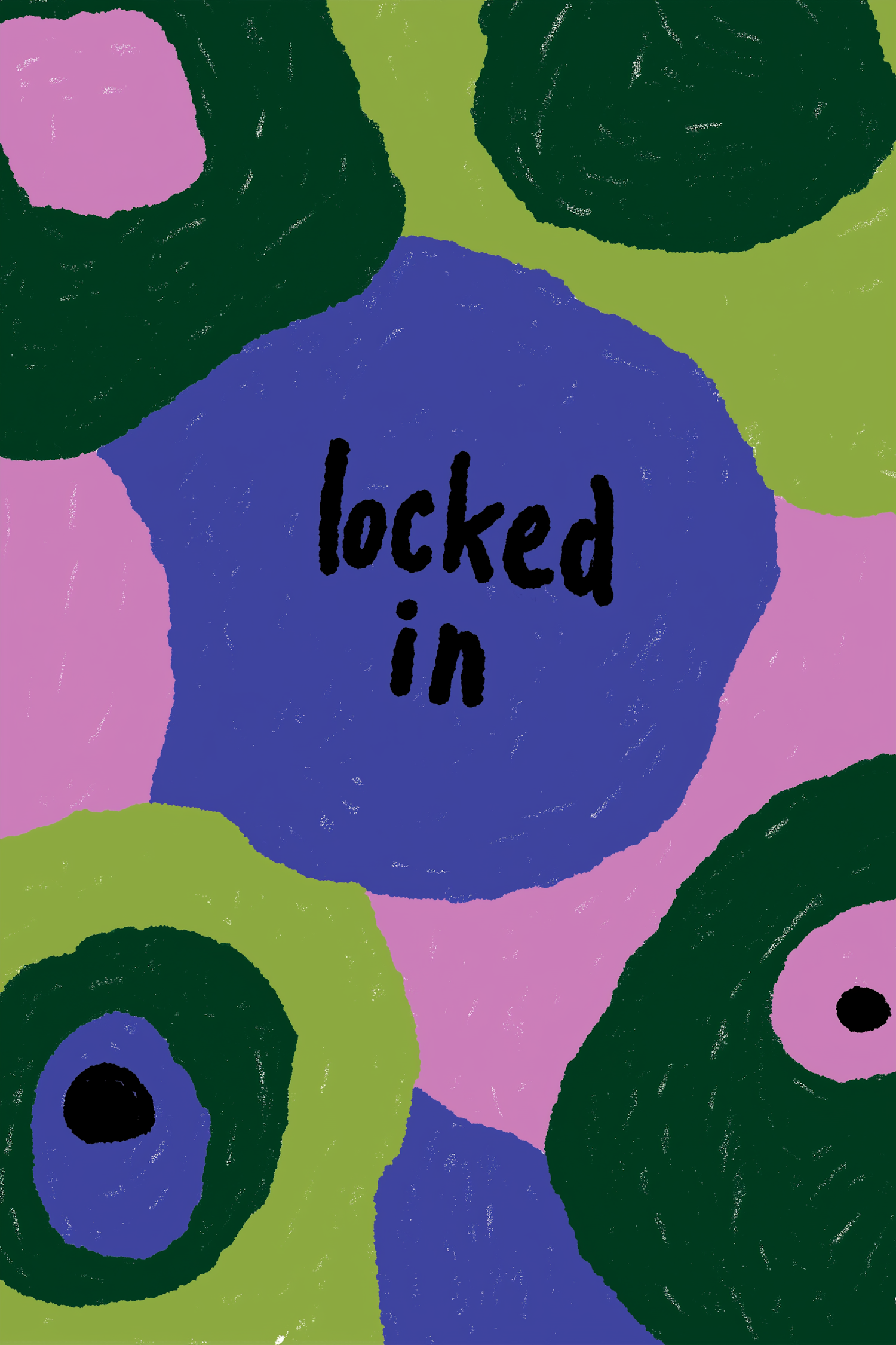 Abstract illustration with bold colors, featuring the text 'locked in' surrounded by organic shapes and concentric circles.