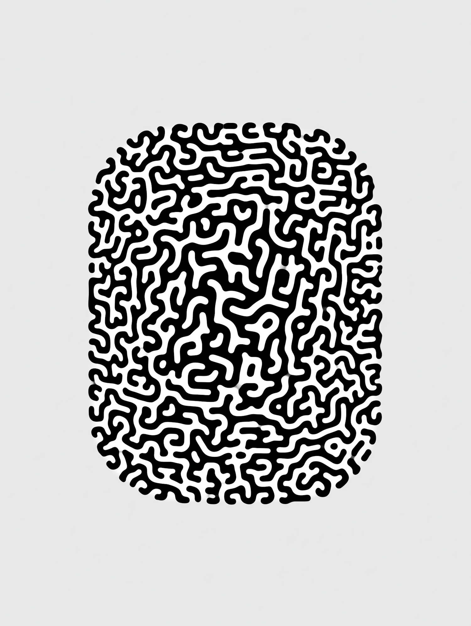 Abstract black and white maze-like pattern in a rounded rectangular shape, perfect for modern art or design inspiration.