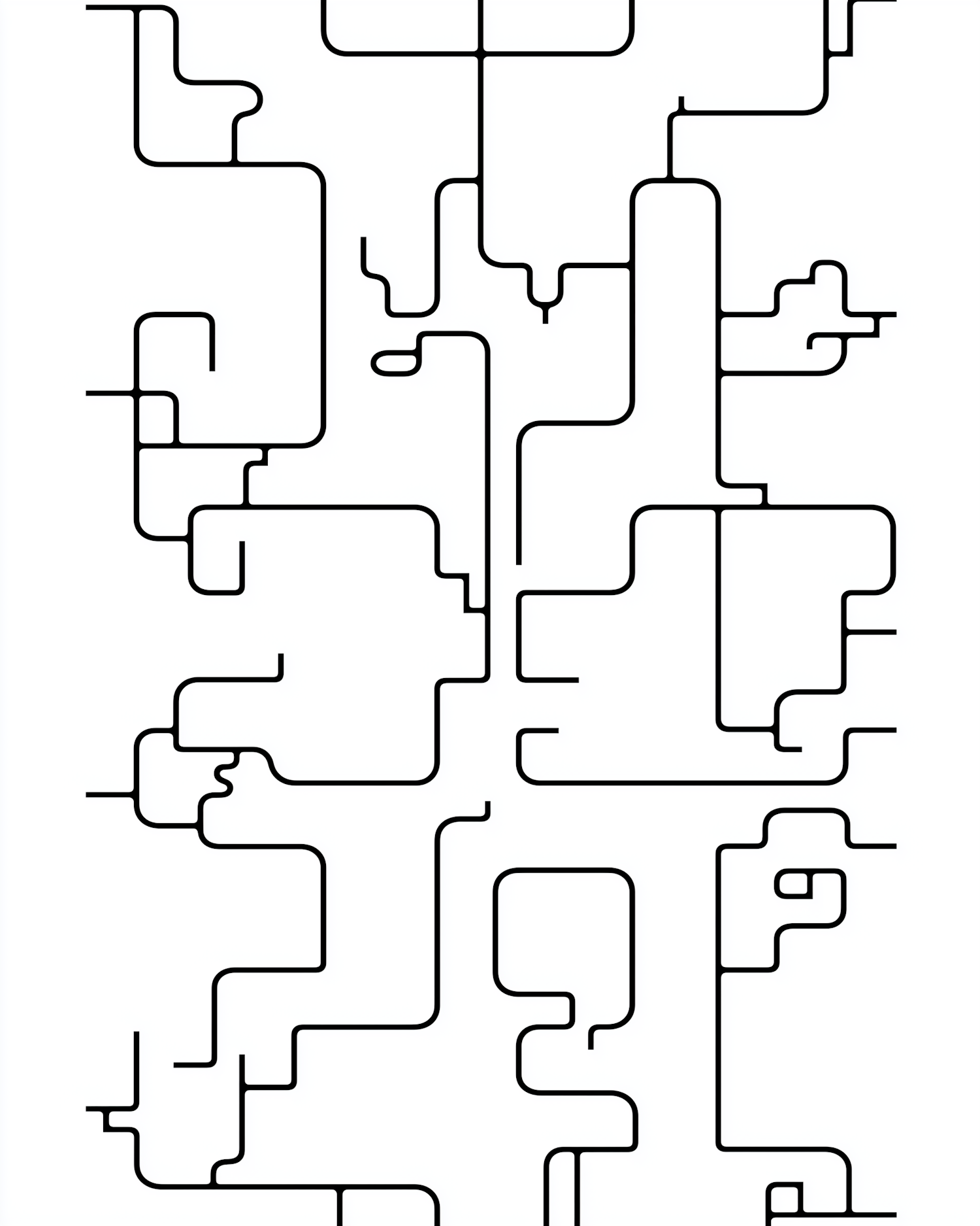 Abstract black line art on a white background, forming a maze-like geometric pattern with sharp angles and smooth curves.