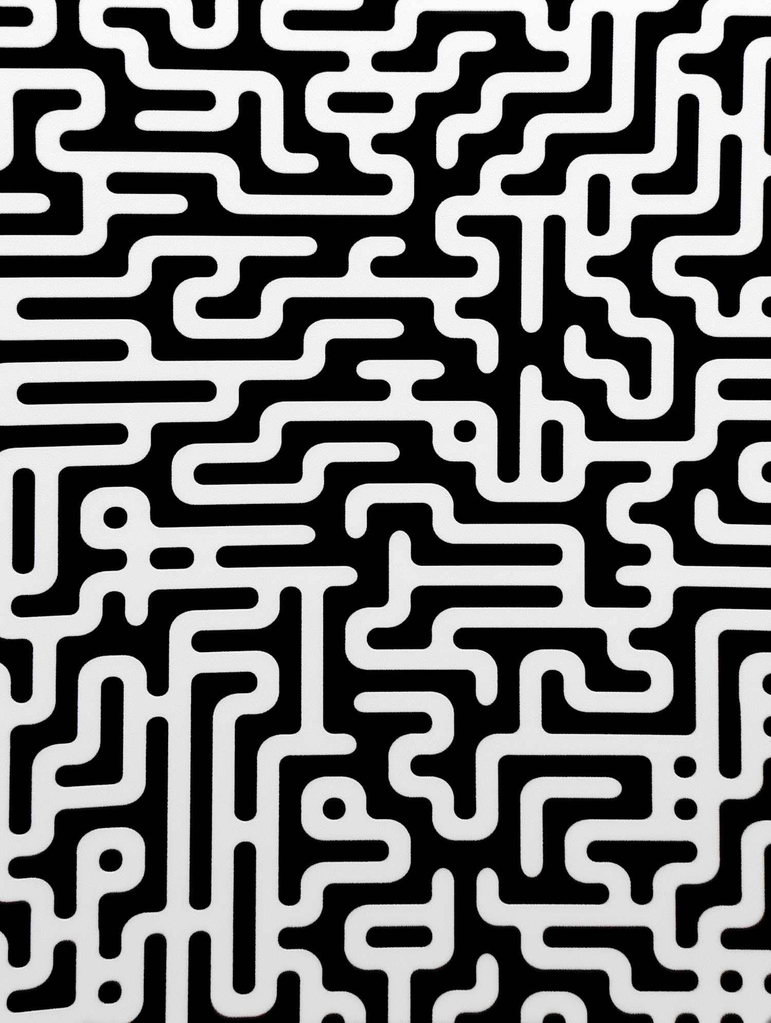 Abstract black and white maze-like pattern with curving white lines on a black background, creating a modern and intricate design.