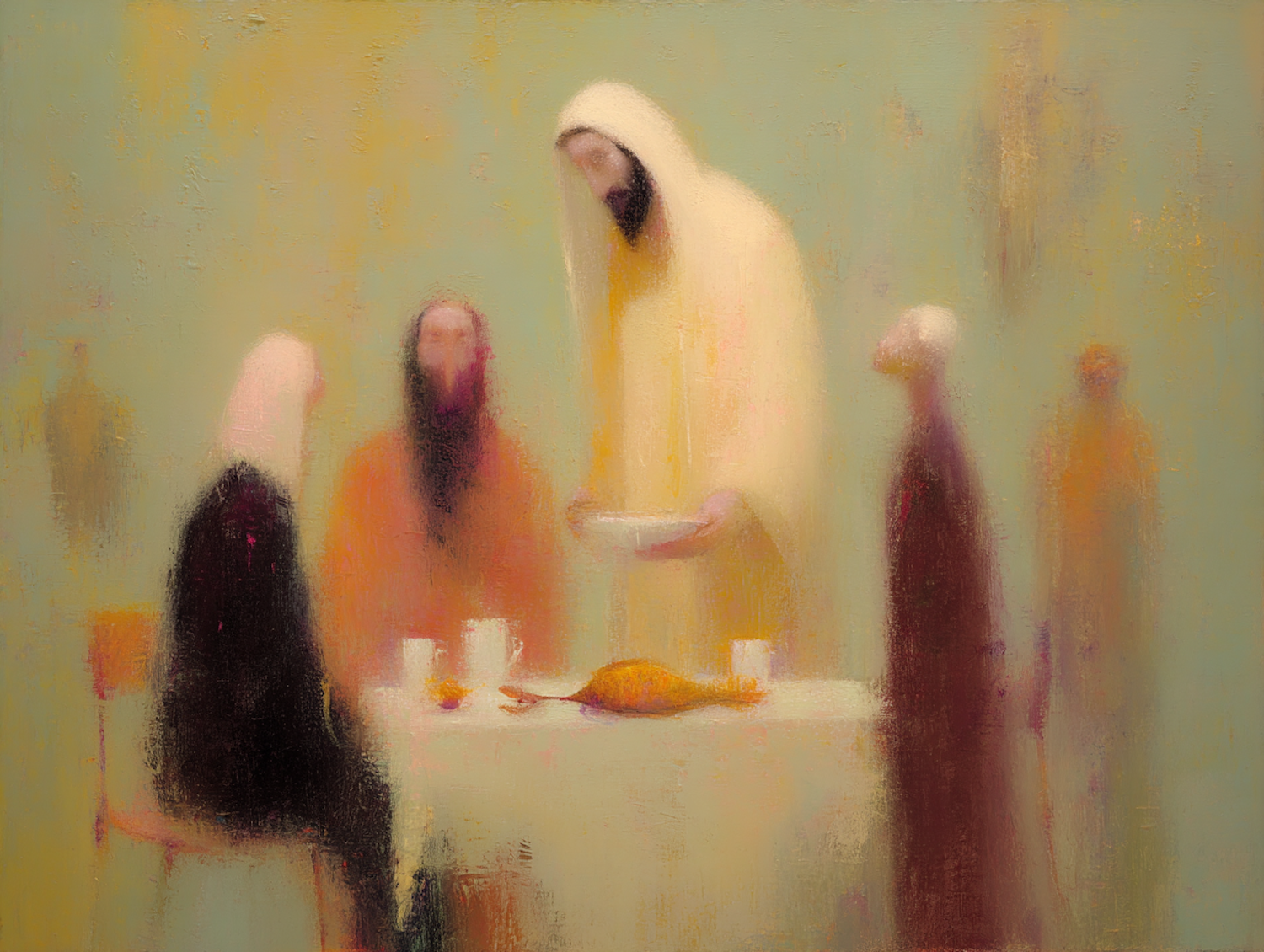 An atmospheric, abstract painting featuring a serene dining scene with softly rendered figures and warm, gentle tones.
