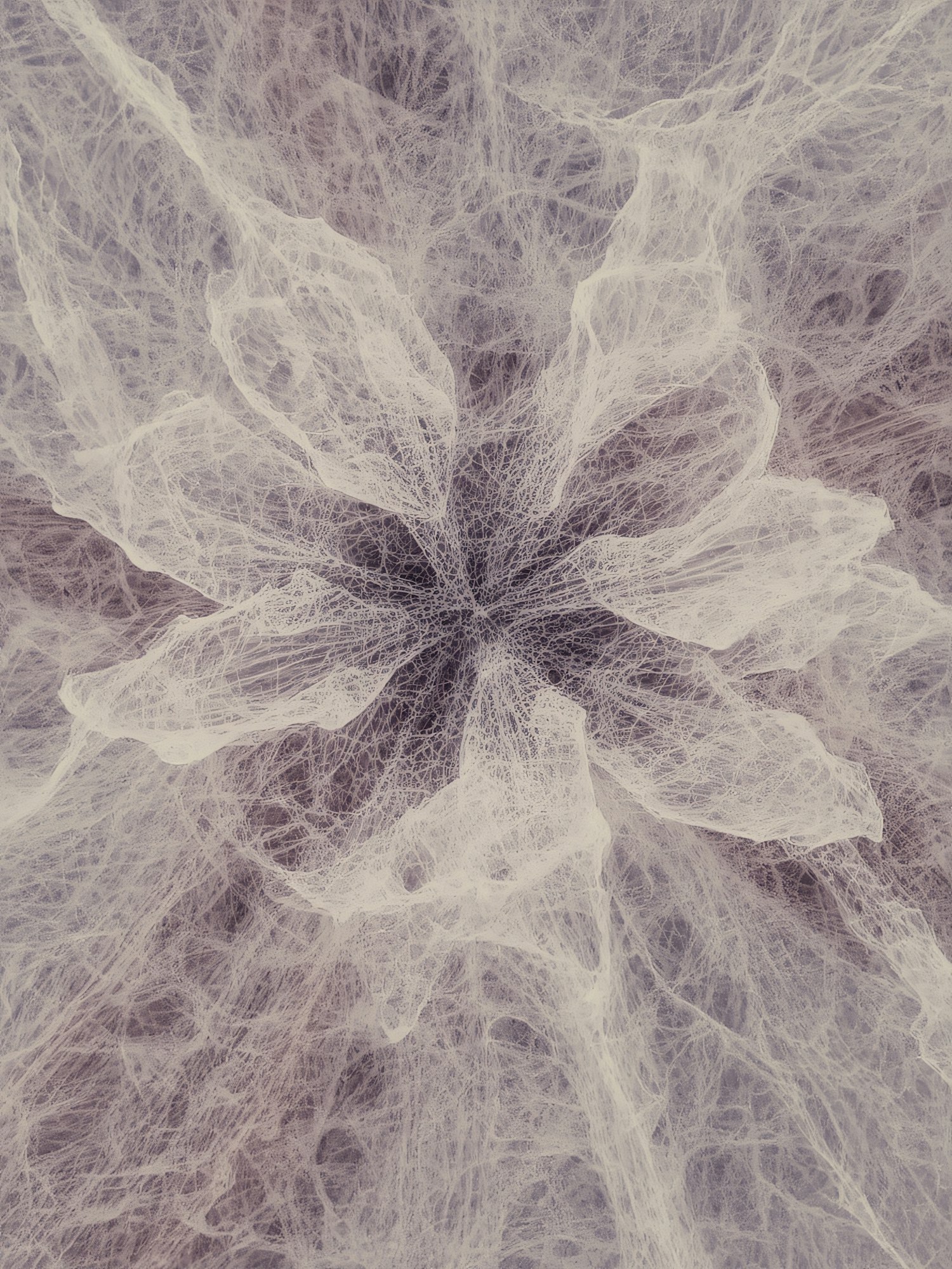 Abstract web-like structure with intricate white lines on a muted purple background, creating a sense of depth and ethereal beauty.