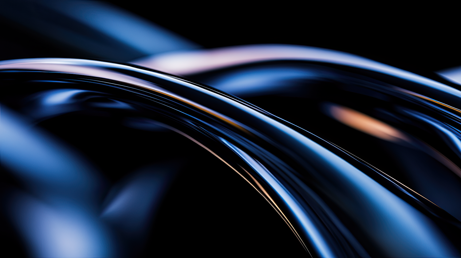 Abstract close-up of glossy, curved metallic surfaces with blue and gold reflections against a black background.