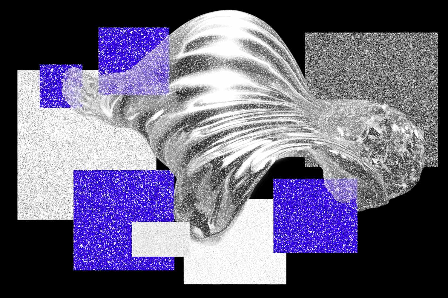 Abstract art with metallic fluid forms and vibrant blue and white textured blocks on a black background.