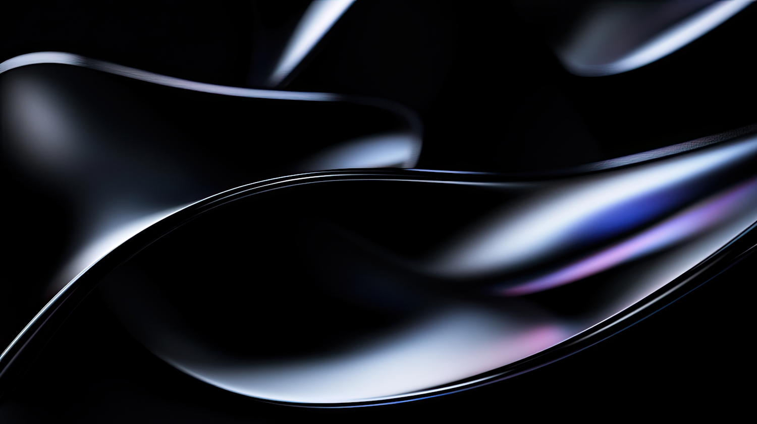 Abstract close-up of glossy metallic curves reflecting silver, blue, and purple hues against a dark background. Futuristic and sleek design.