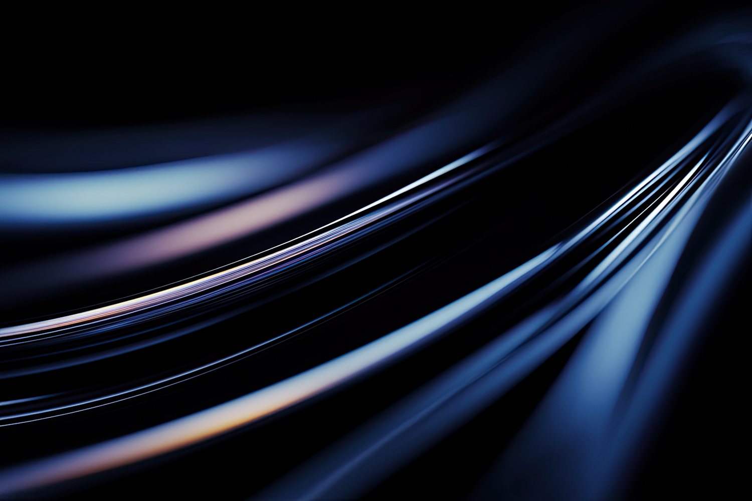 Abstract flowing lines in blue and black with a metallic, reflective finish, creating a futuristic and dynamic visual effect.