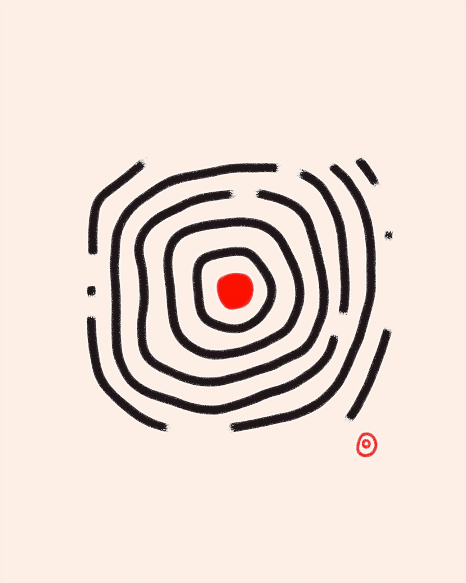 Minimalist abstract art with black concentric lines around a red dot on a beige background. A smaller red circle adds balance to the design.