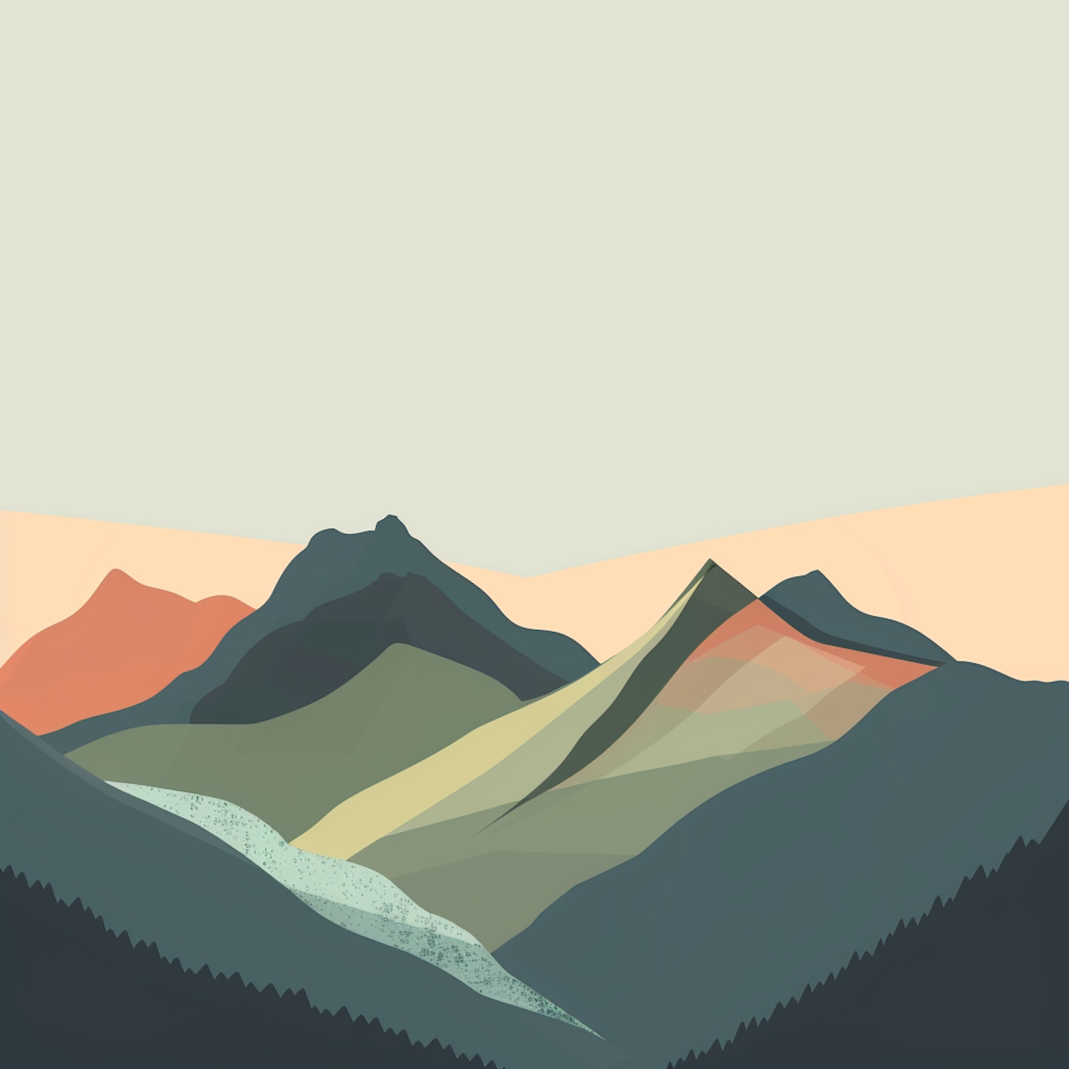 Minimalist mountain landscape illustration with geometric shapes and muted colors, creating a serene and modern abstract feel.