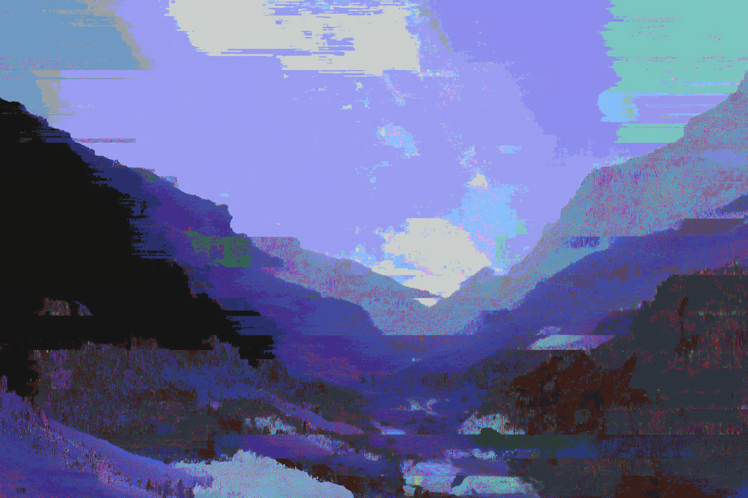Glitch pixel background image depicting a mountainous valley with vibrant blue and violet tones, creating a surreal, dreamlike atmosphere.