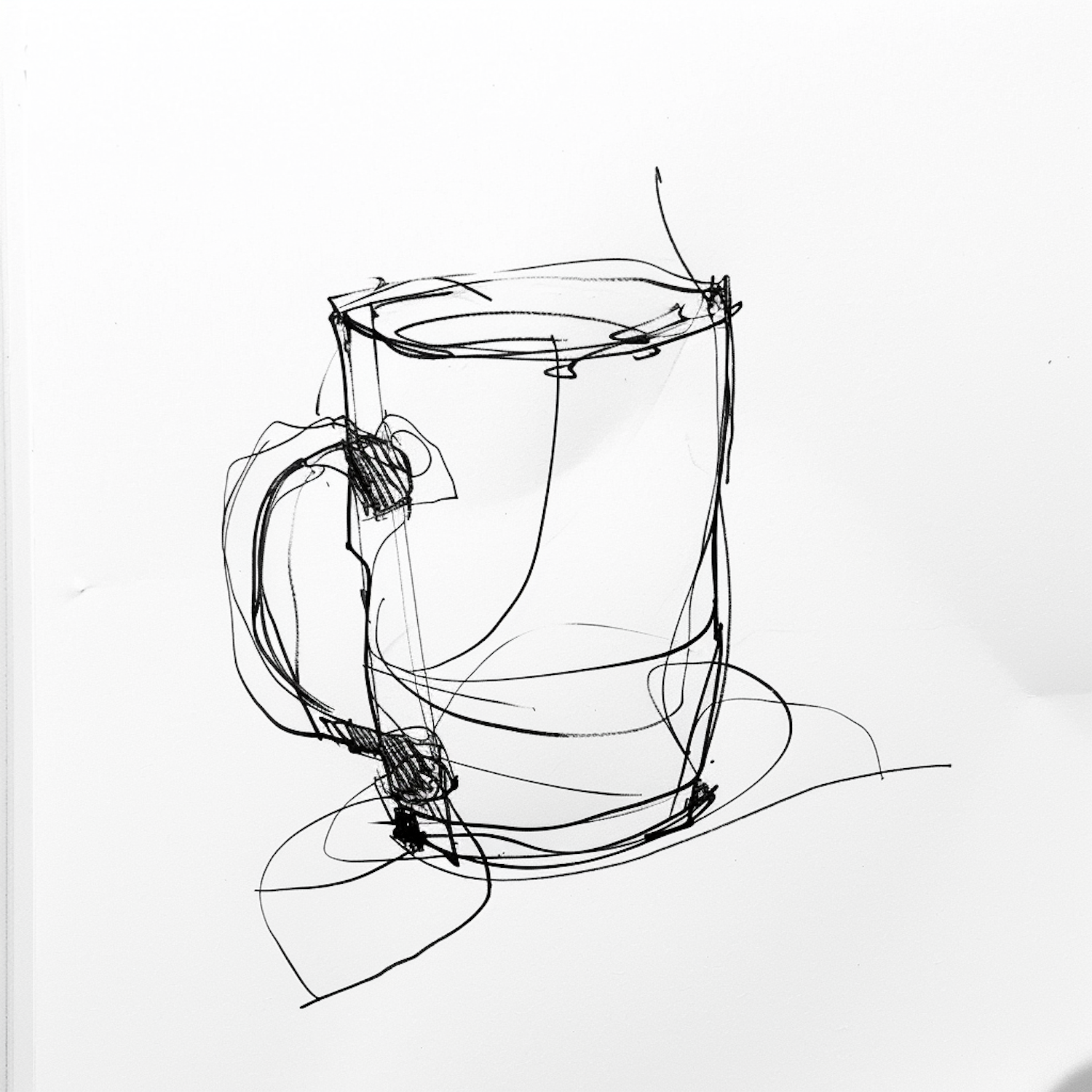Abstract black ink sketch of a mug with loose, overlapping lines on a white background, showcasing minimalist and dynamic artistry.