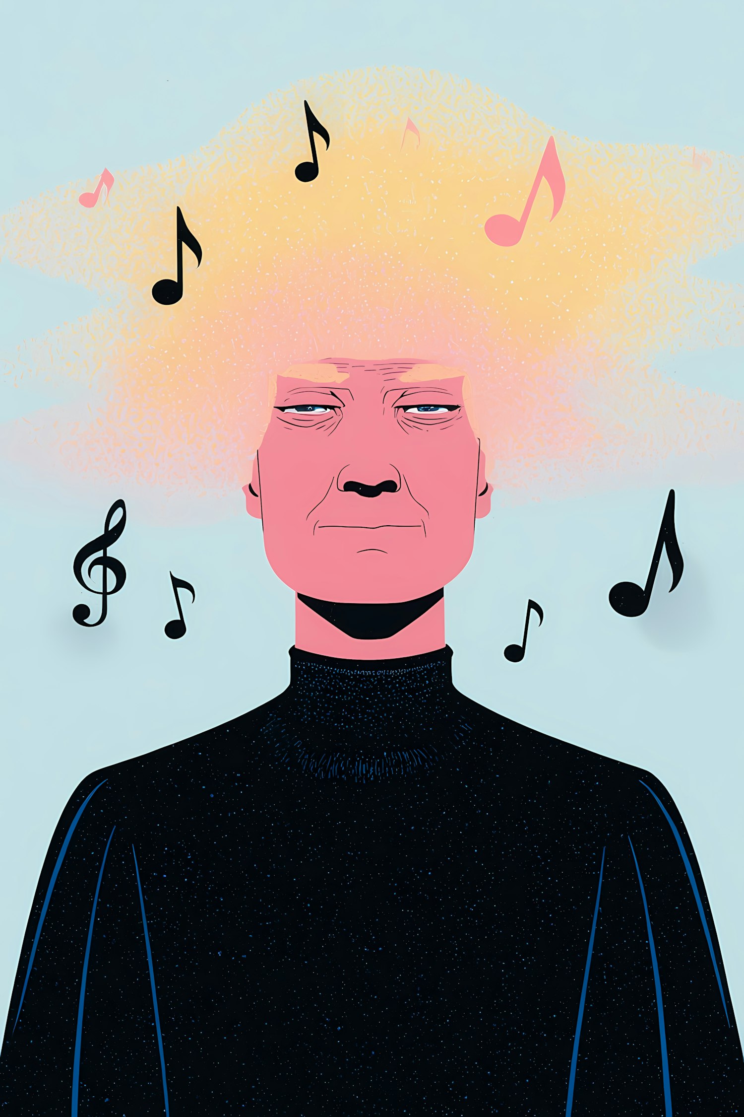Abstract illustration of a person with musical notes in their hair, symbolizing creativity and music, set against a light blue background.