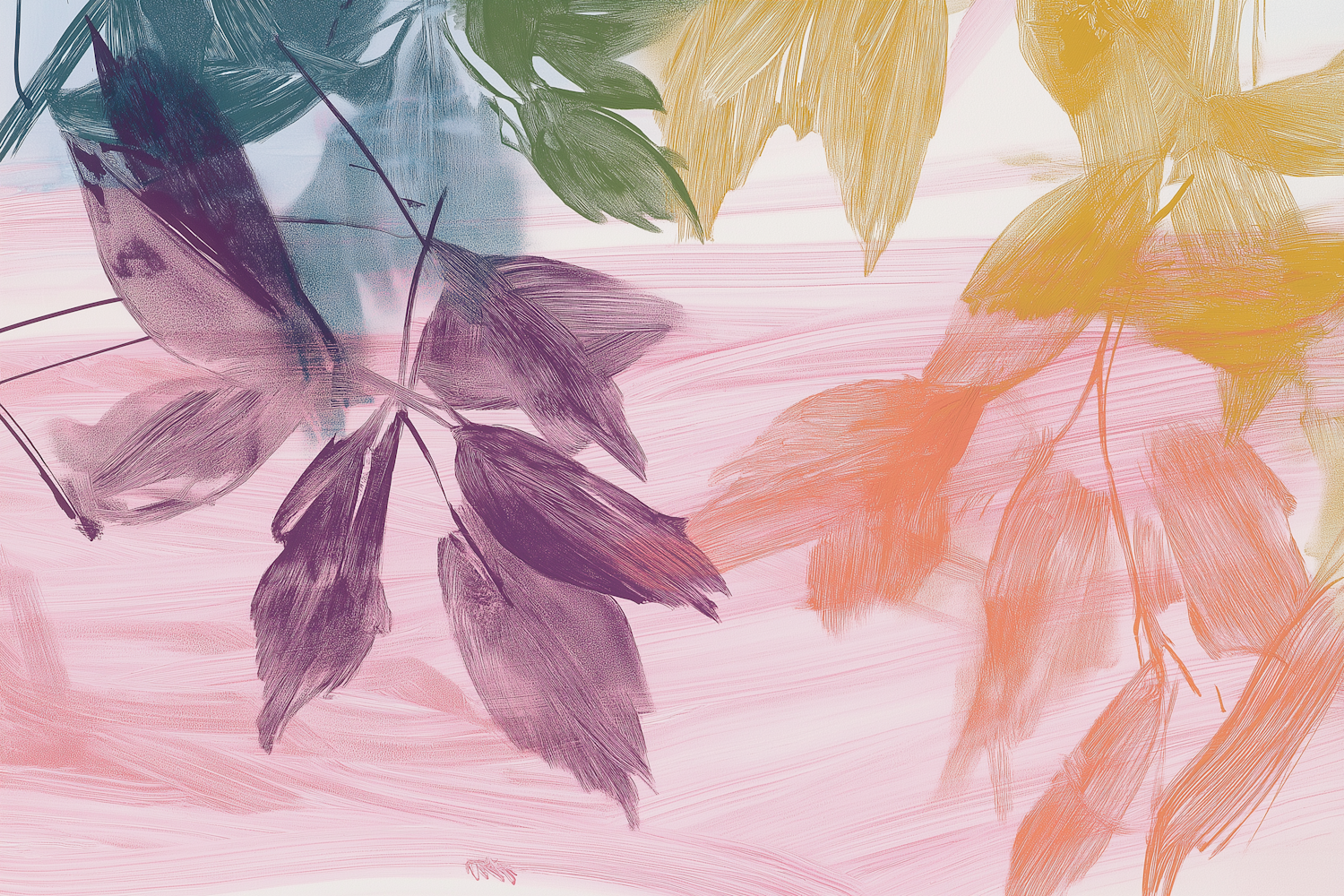 Abstract painting with colorful leaves in purple, green, yellow, and orange on a pink background. Vibrant and dynamic composition.