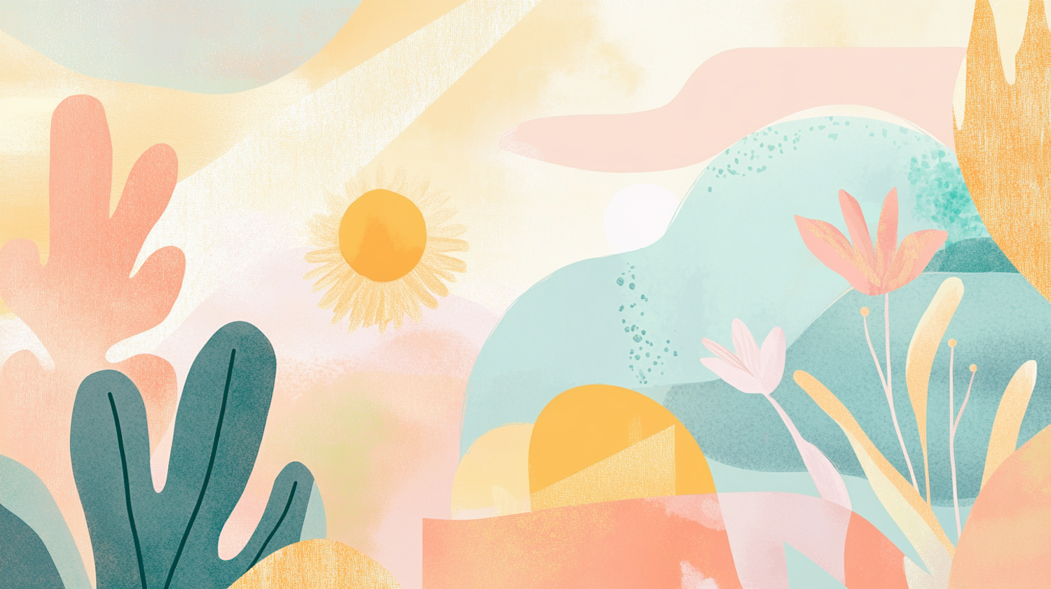 Abstract pastel illustration with organic shapes, sun, and flowers. Soft colors create a serene and harmonious atmosphere.