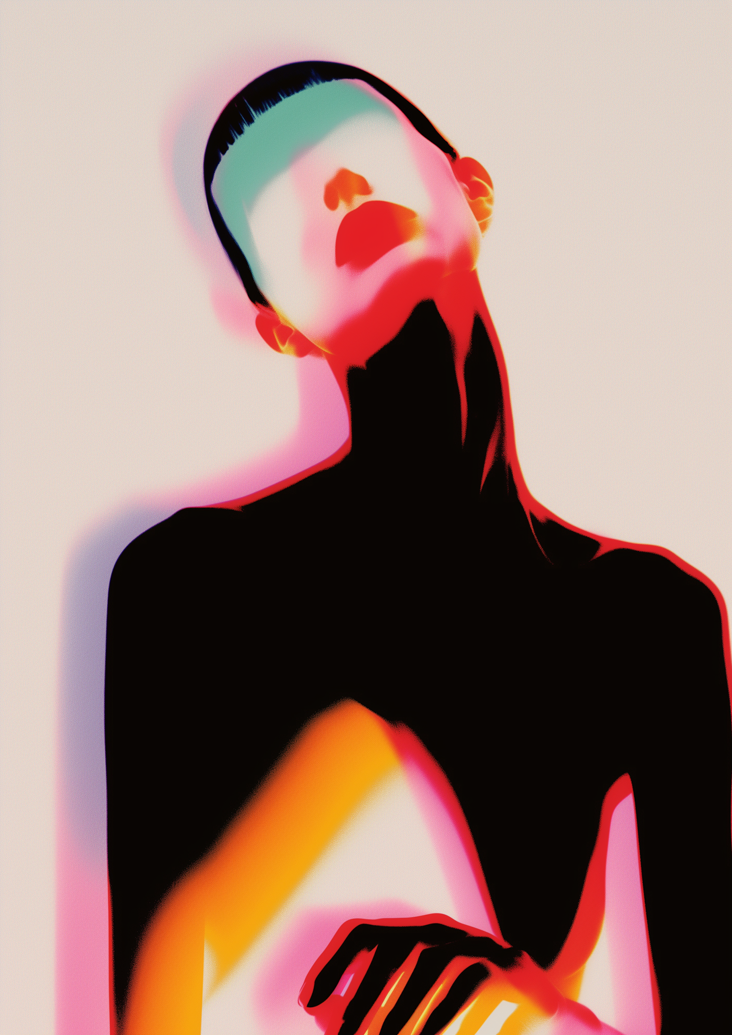 Abstract neon illustration of a silhouetted figure with vibrant red, pink, and green highlights on a soft beige background.