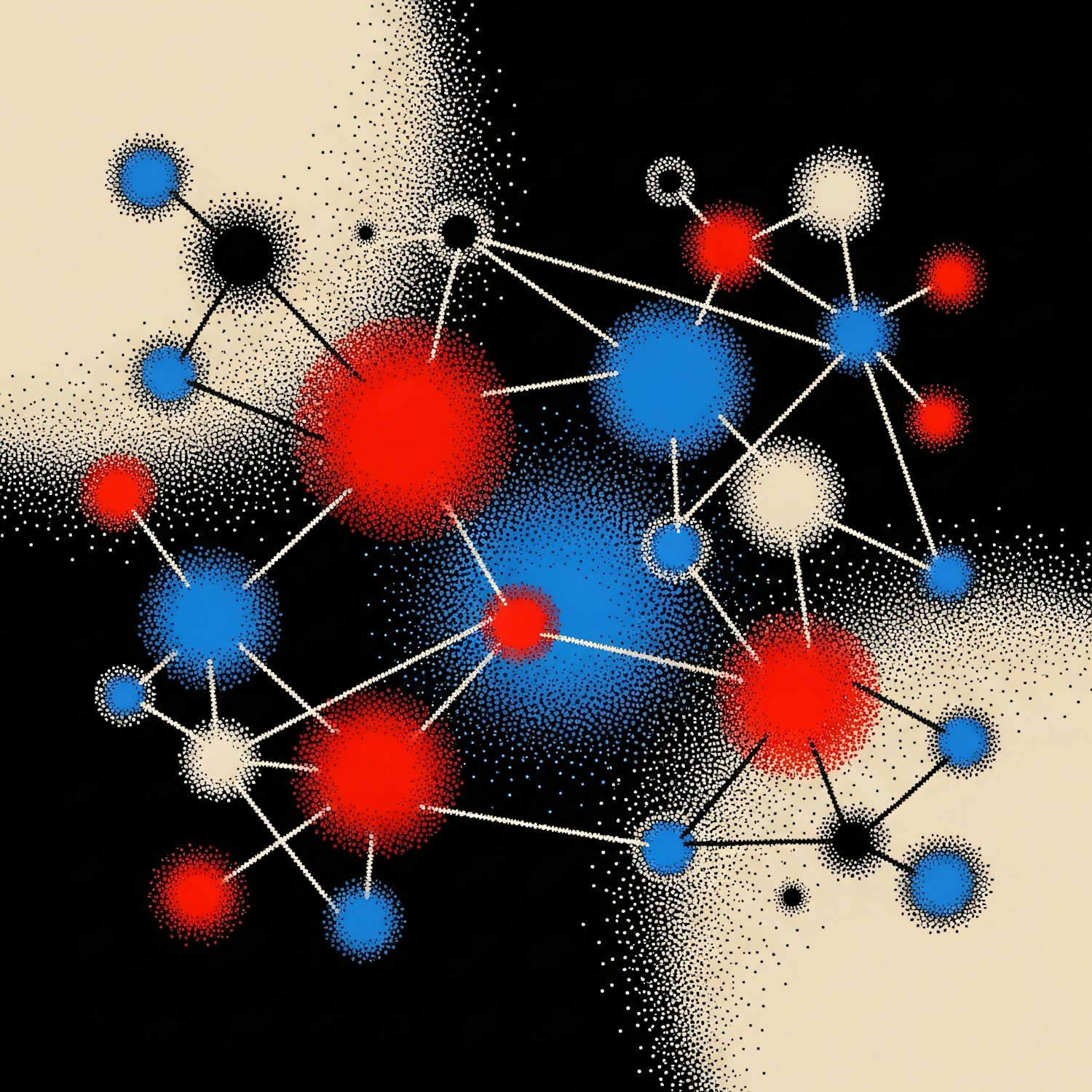 Abstract illustration of a network with red, blue, and white nodes connected by lines on a black and beige stippled background.