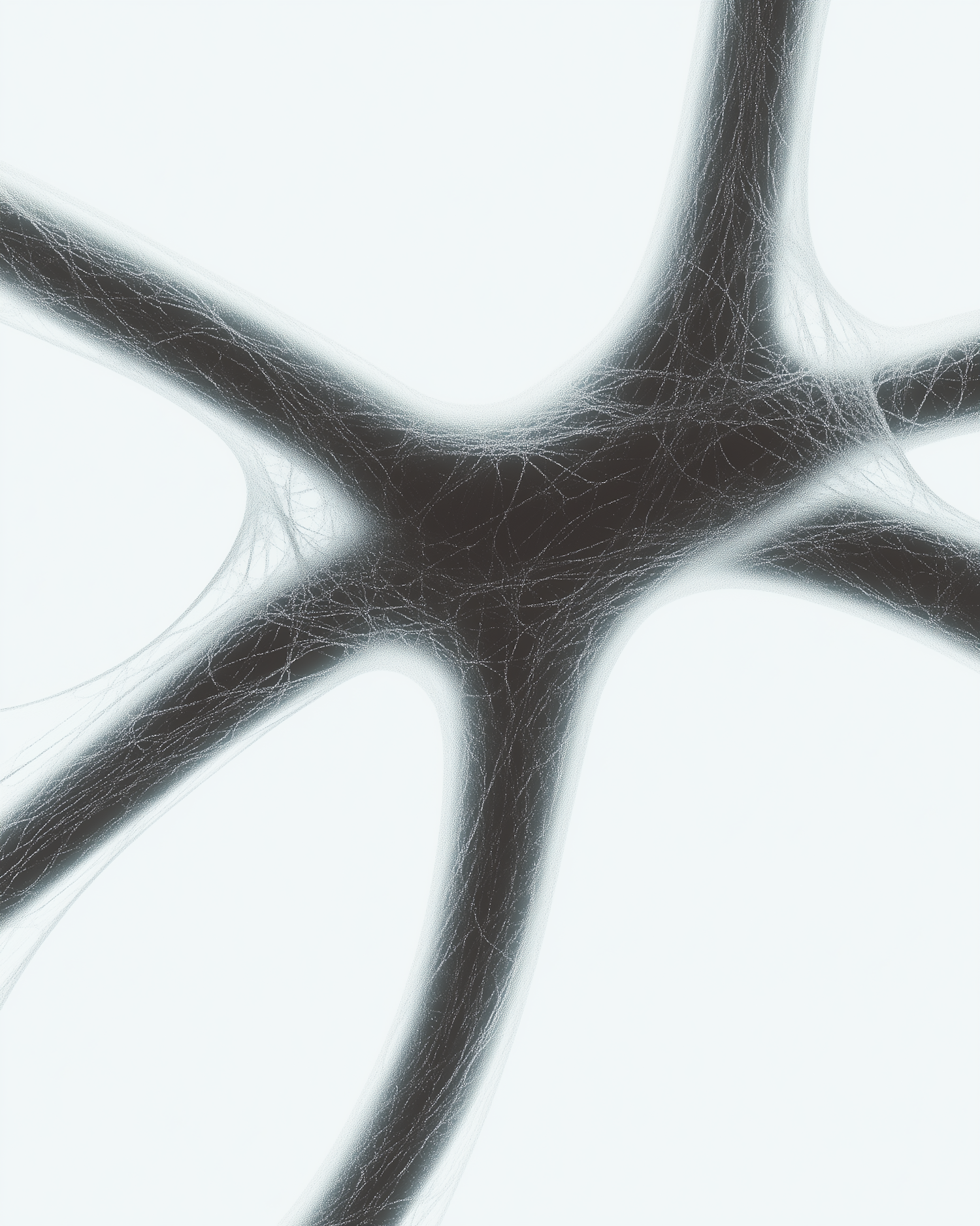 Abstract fibrous network of dark strands on a pale background, resembling neural or organic structures with intricate details.