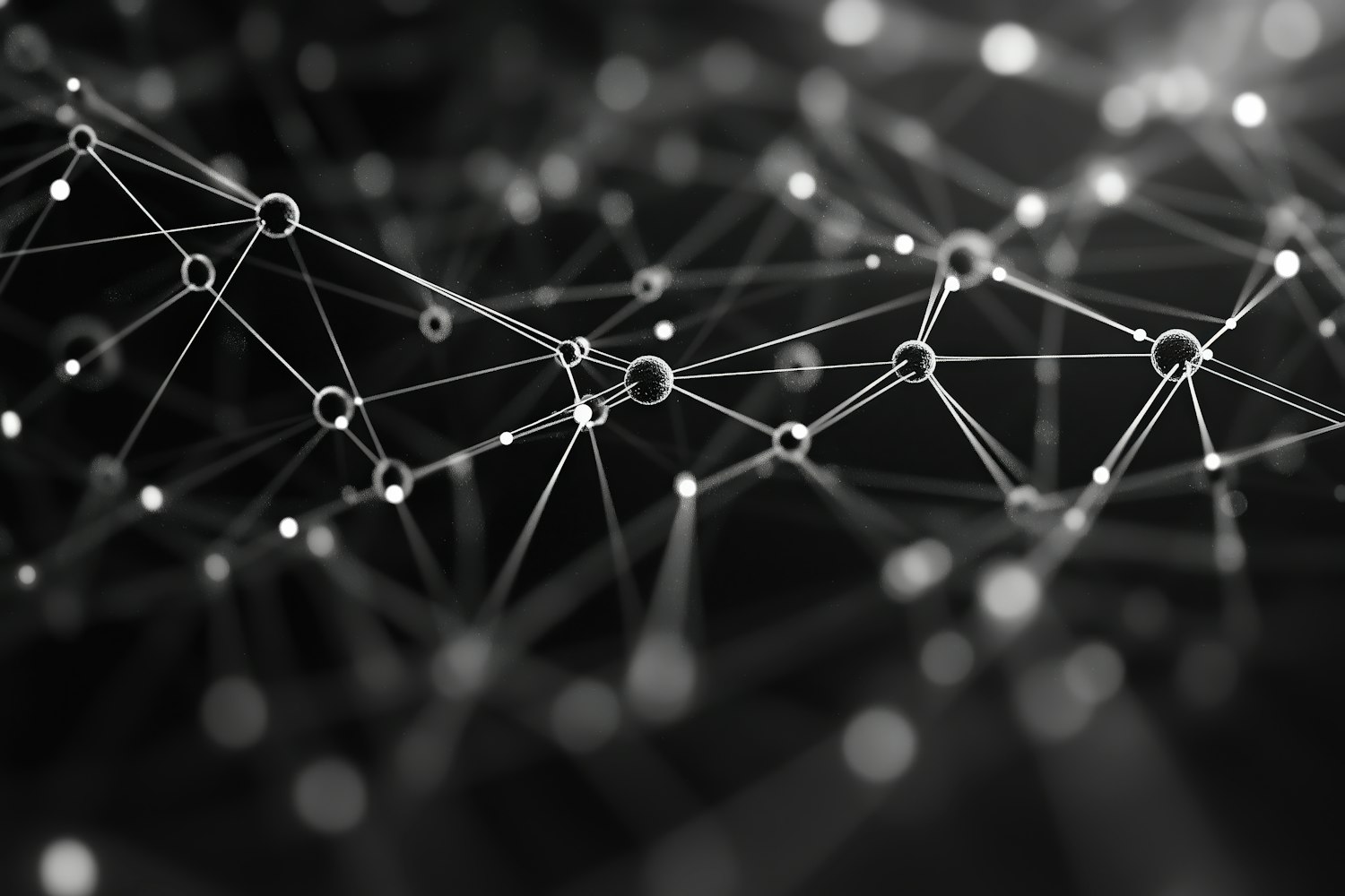 Abstract network visualization with glowing nodes and lines on a dark background, evoking themes of technology and connectivity.