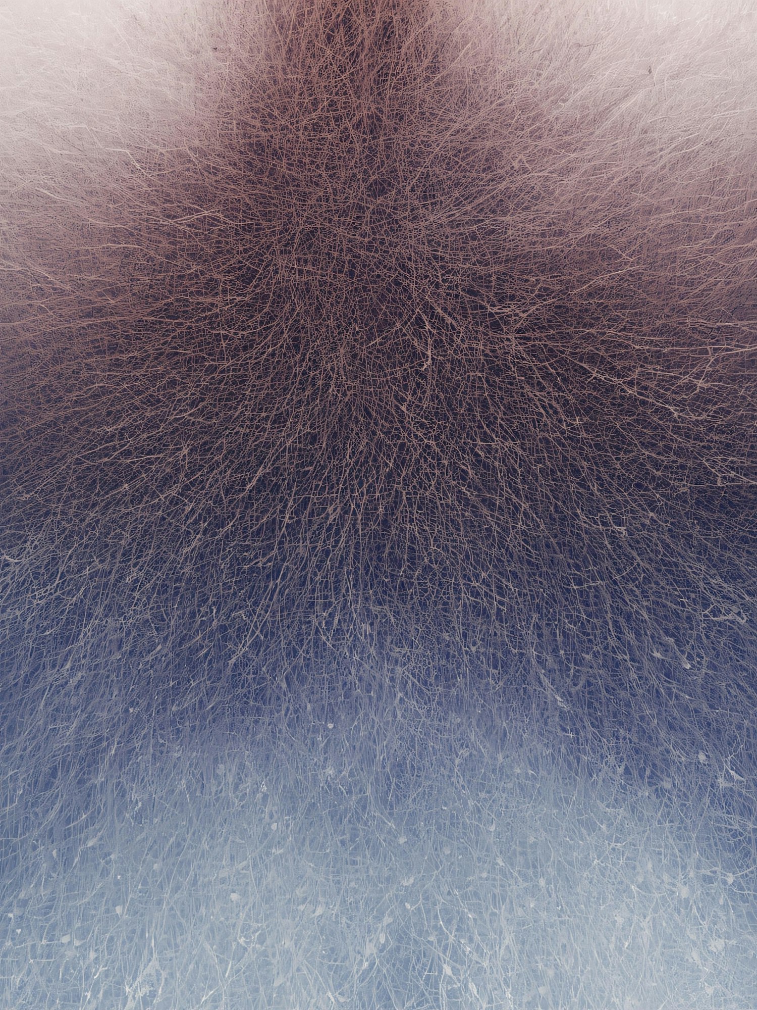 Abstract web-like structure with a gradient from reddish-brown to blue, resembling a dense network or fibrous texture.