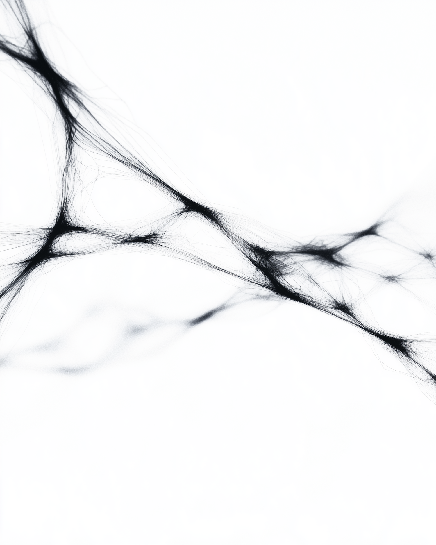 Abstract black strands resembling neural networks or webs on a white background, showcasing intricate and delicate connections.