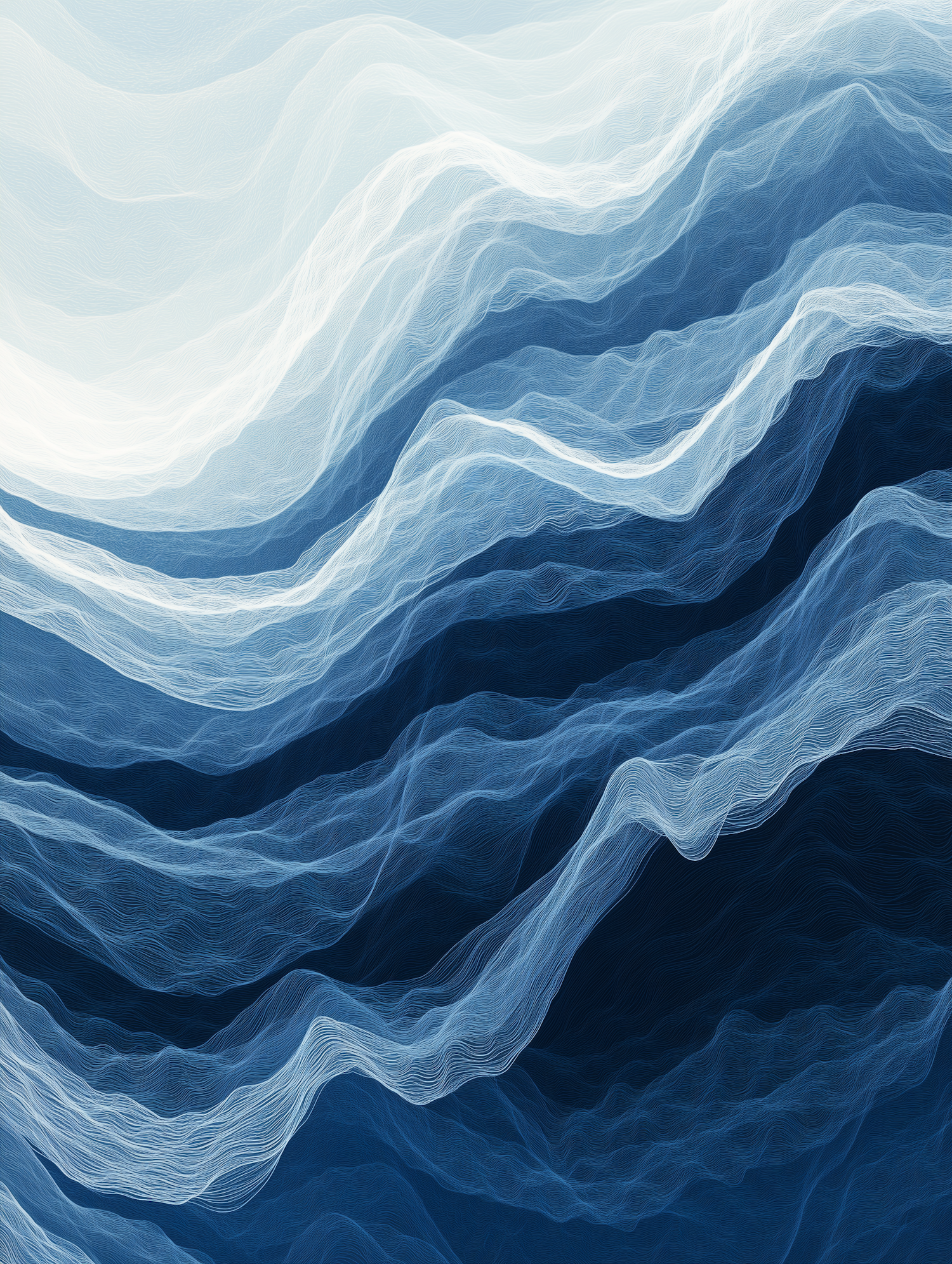 Abstract waves in shades of blue and white create a serene, flowing design with intricate textures and a sense of depth.