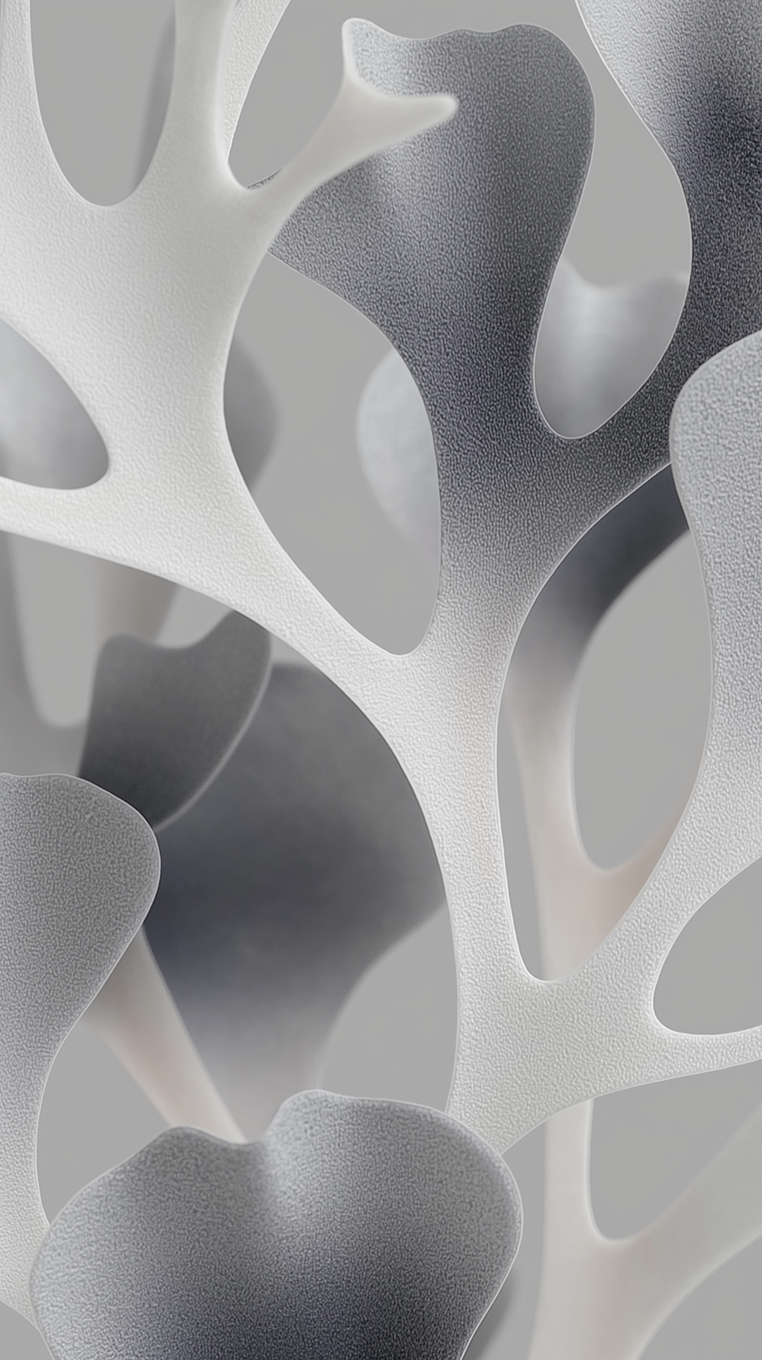Abstract organic structure in white and gray tones with a textured finish, resembling sculptures or corals against a gray background.