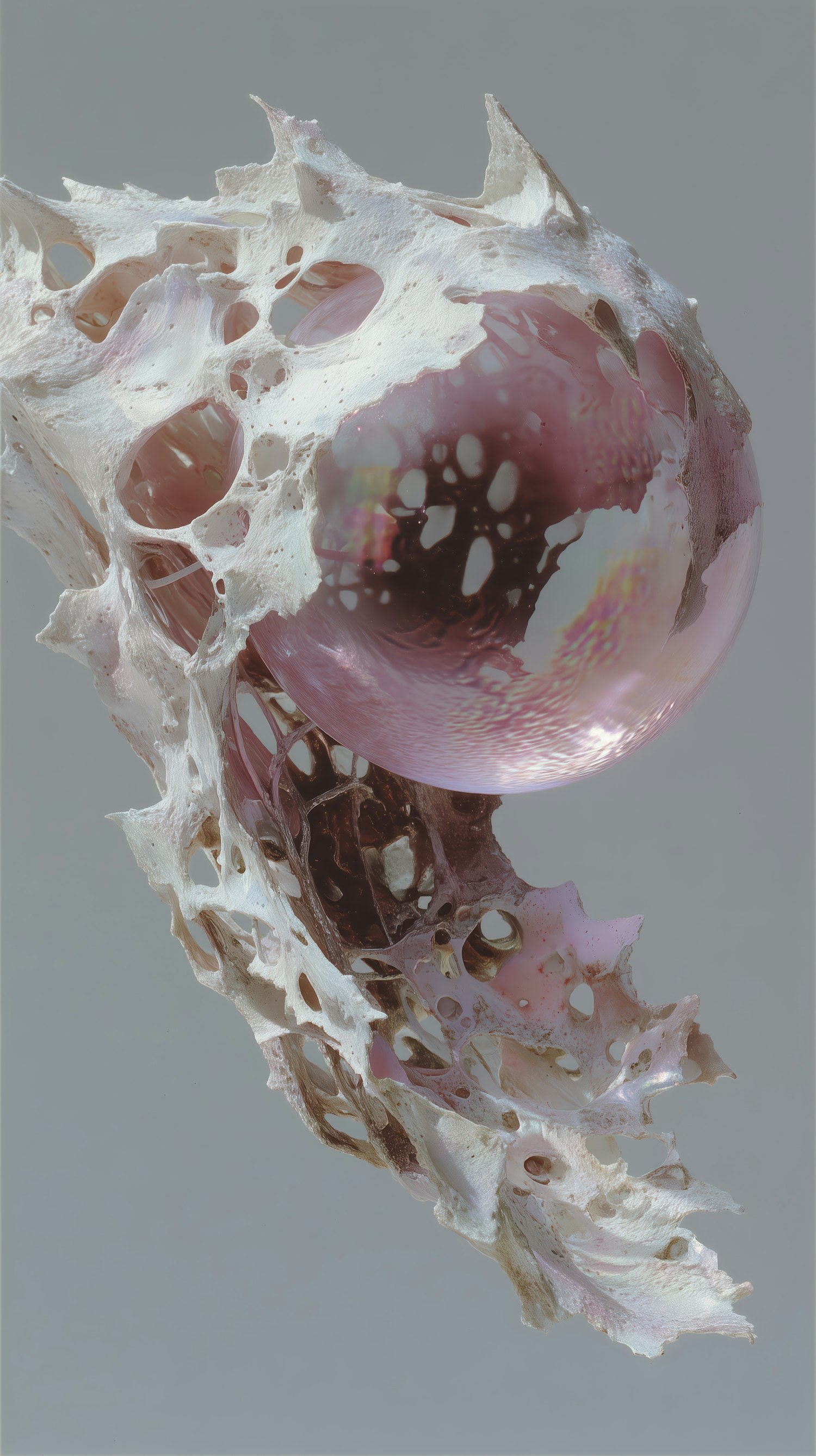 Abstract organic structure with a glossy pink sphere, resembling coral or bone, set against a neutral gray background.